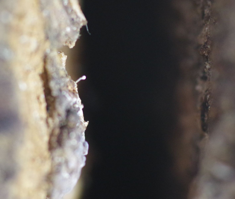 im fingerbreiten Riss einer Esche einige weiße Nadeln, offensichtlich Sclerophora - aber keine Chance die zu entnehmen. Der Riss wird sich irgendwann breiter, oder man muss eine lange Pinzette mitnehmen.