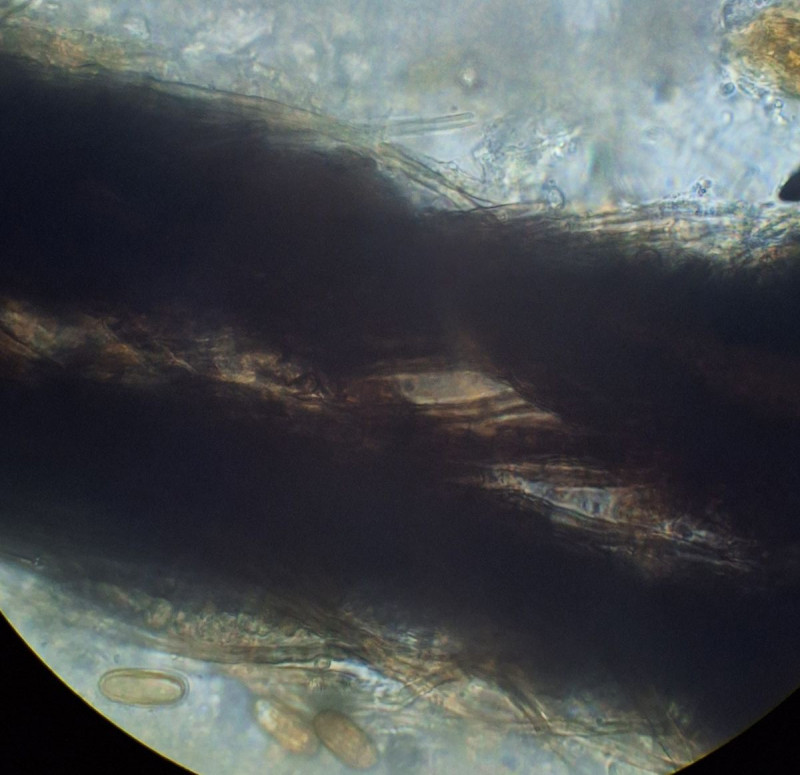 Der Stiel sieht unterm Mikroskop halbwegs so aus, wie es sich für eine Stecknadel gehört, hat aber außen transparente, lang durchlaufende Hyphen - die ich so noch bei keiner Stecknadel gesehen habe.