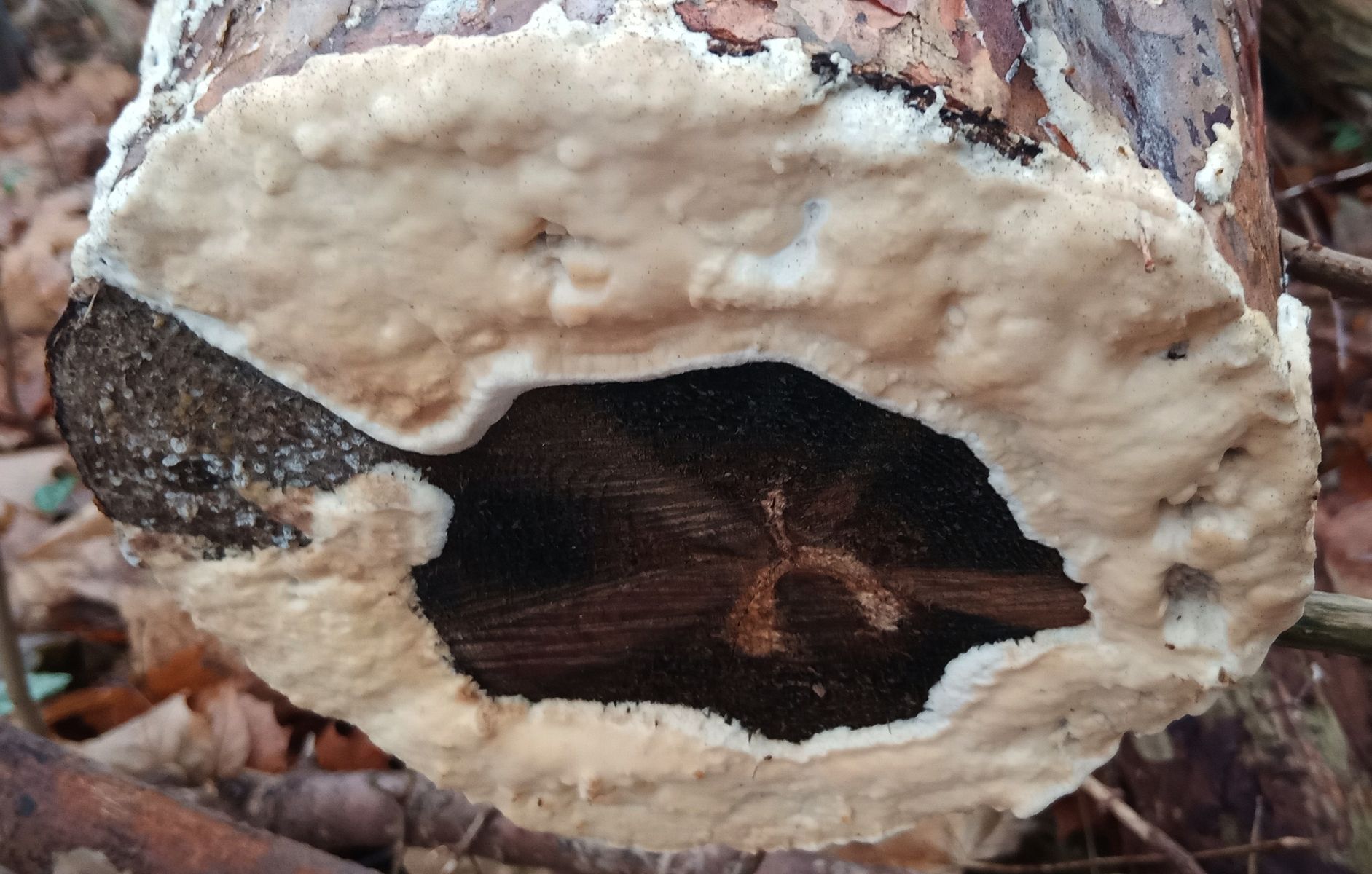 Ich gehe da öfter vorbei und werde den weiter beobachten und ein Stück abschneiden. Eigentlich ist der für Dacryobolus karstenii schon zu dick. Der soll angeblich nur 1 mm dick werden.