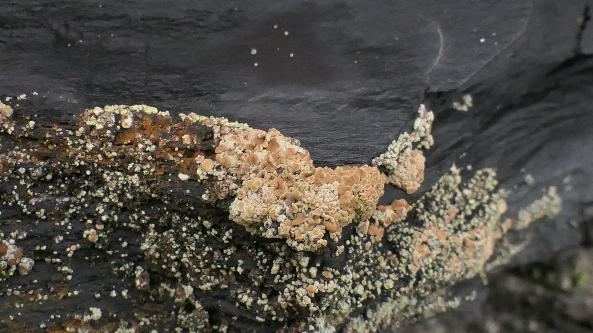 Folgende auffällige Krustenflechte stammt von einer eisenreichen Schiefer-Natursteinmauer in NW-Ausrichtung im Thüringisch-Fränkischen Schiefergebirge.