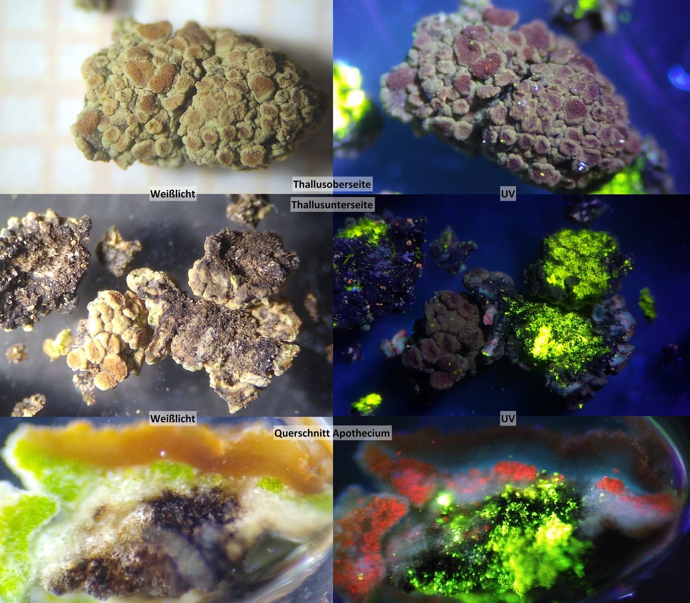 Bild 4 Aufsicht auf Probe und Probenunterseite; Querschnitt durch Apothecium - jeweils im Weißlicht und unter UV-Beleuchtung.