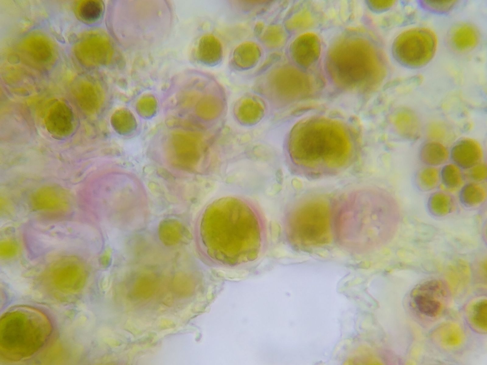 Bild 9 Die Algenhüllen sind dick und reagieren in K/J rot-violett - das habe ich bisher nie beobachtet.