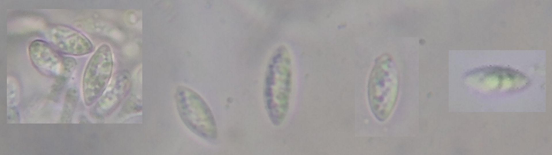 Bild 7: Einige Sporen: farblos, 1zellig, spindelförmig. Sporengröße 10-12,5-(14) x 5-6 µm