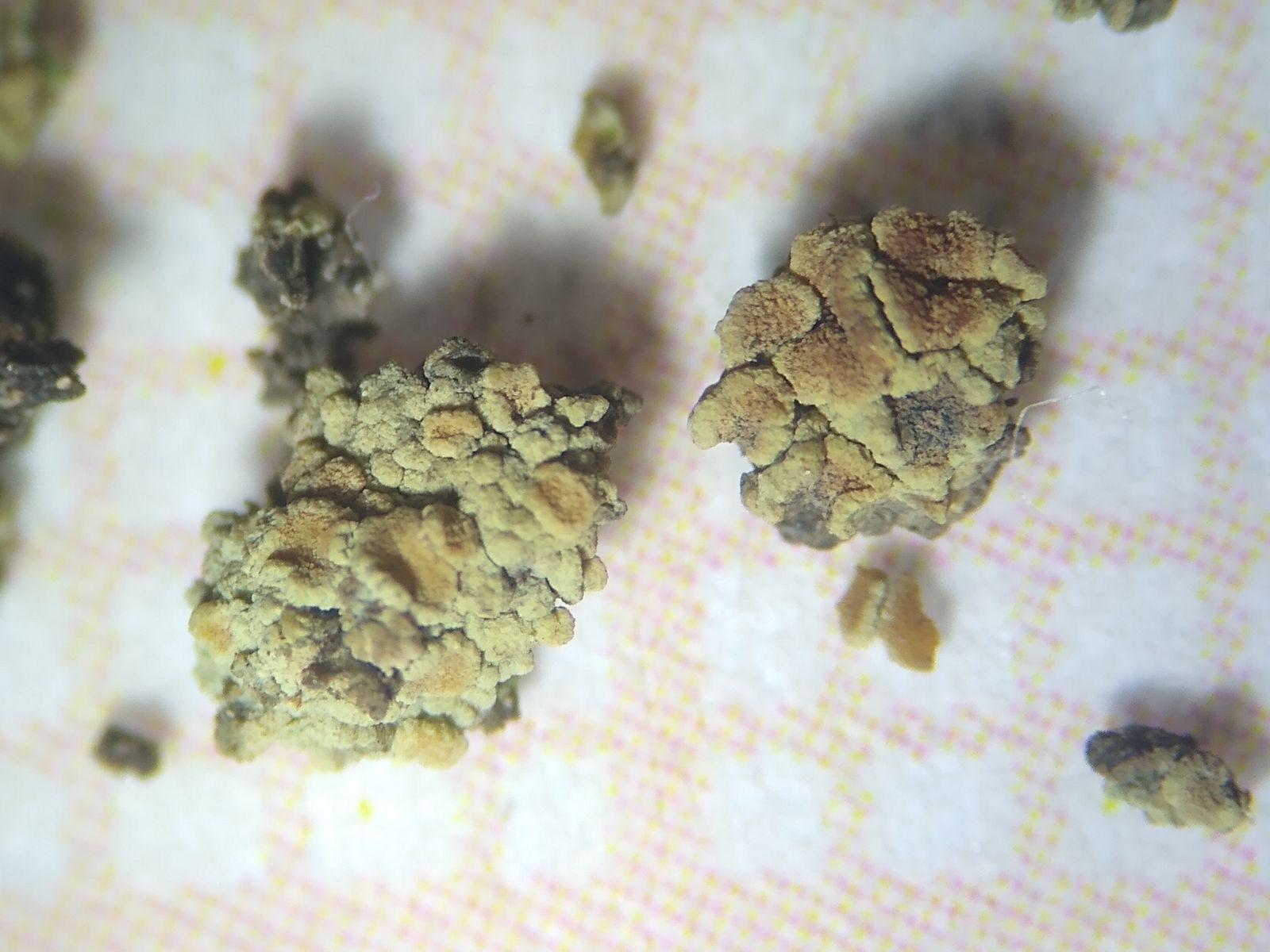 Da die jungen, noch sehr kleinen Thalli in der Nähe schuppenartig wirken und bereits Ascocarpe tragen können, würde ich mehr an einen vollständig schuppigen Bau denken, zumal auch die Kratzprobe schnell in kleine Einheiten zerfällt.