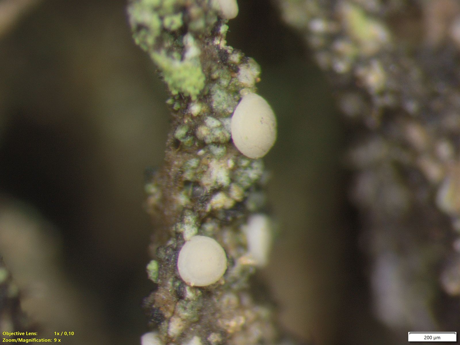 Makrofotos auf dem Feld habe ich leider nicht, ich habe die Flechte erst bei der Nachbereitung meiner Proben gefunden. Über Gattungsschlüssel bin ich irgendwie nicht zum Zeil gekommen. Das ganze ist offensichtlich ein Teamsport und ich habe über Social Media (Bluesky) den Hinweis bekommen ggf. mal bei Bacidina nachzusehen. Hier passt die generelle Beschreibung ganz gut. Über die Gattungsschlüssel im Wirth und Italic bin ich da nicht hin gekommen.