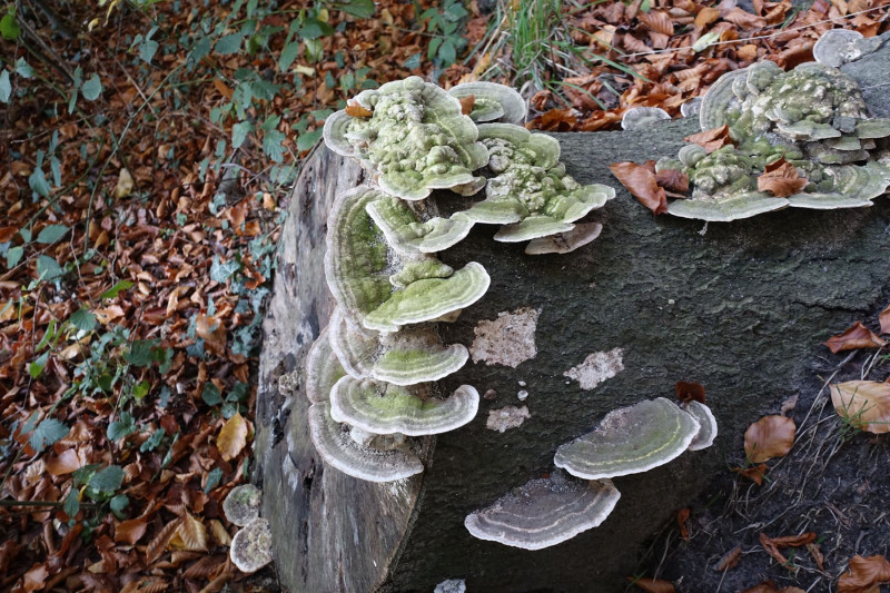 Bild 1: Fruchtkörper breit angewachsen, konzentrisch gezont mit weißer Zuwachszone und teilweise von Algen bewachsen, scharfrandig