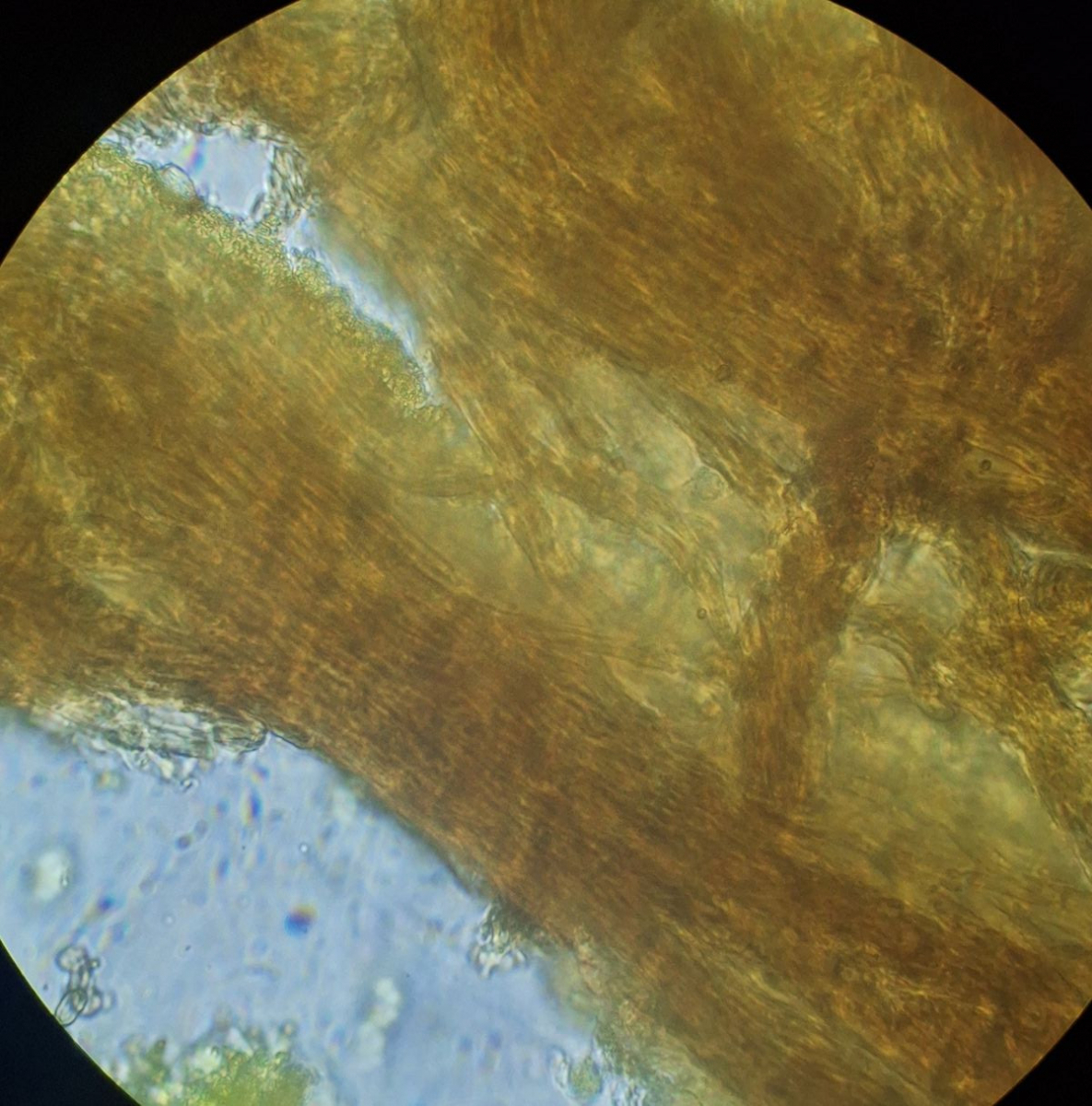 Bei Chaenothecopsis heißt es ja oft, dass die Stiele innen heller sein sollen "zentral aus unregelmäßig verschlungenen Hyphen aufgebaut", während der Rand aus "periklinen Hyphen und dunkler" sei, so Wirth et al. 2013. Aus der Literatur und dem Netz kenne ich nur ein einziges Bild, dass sowas zeigt: