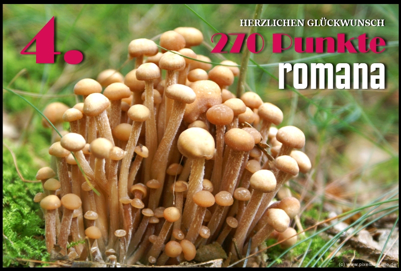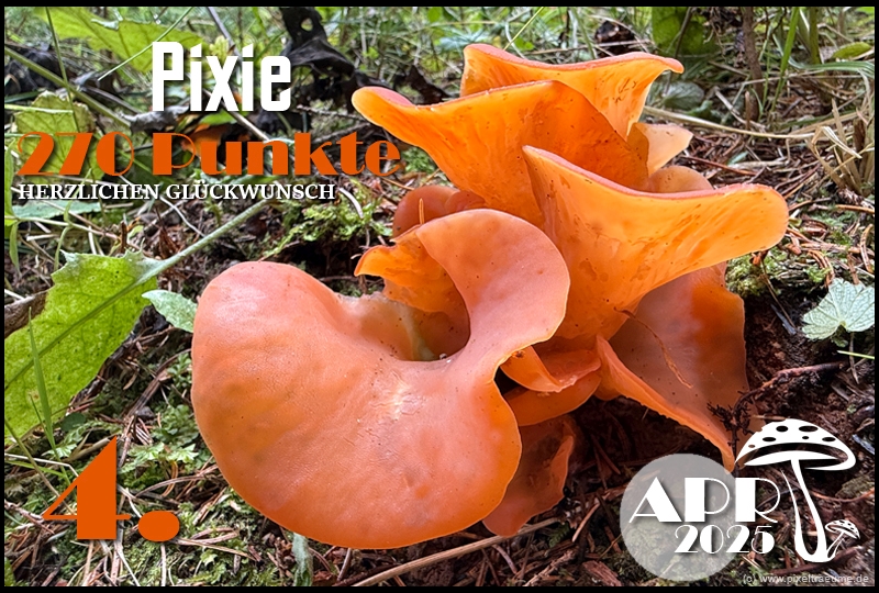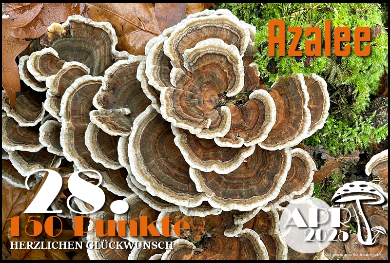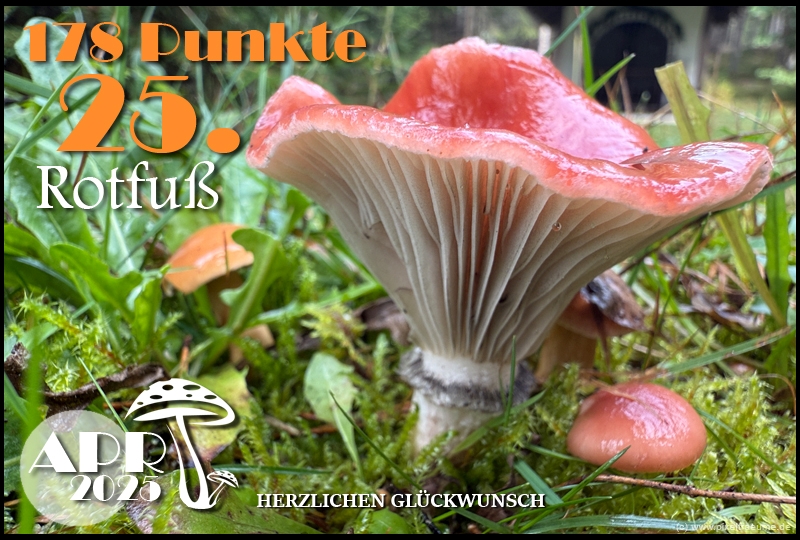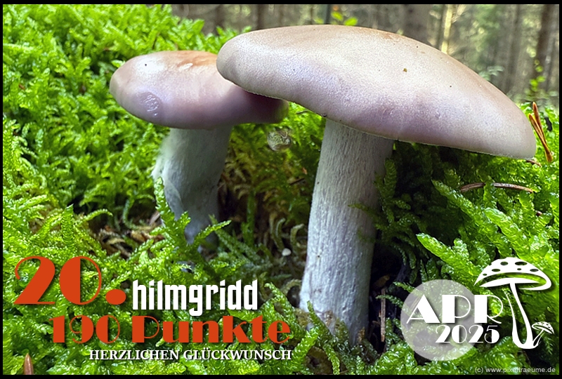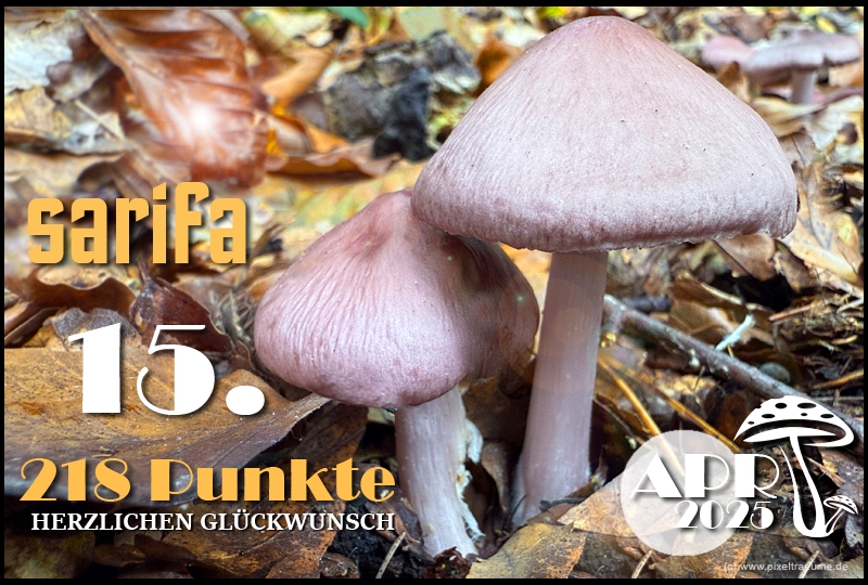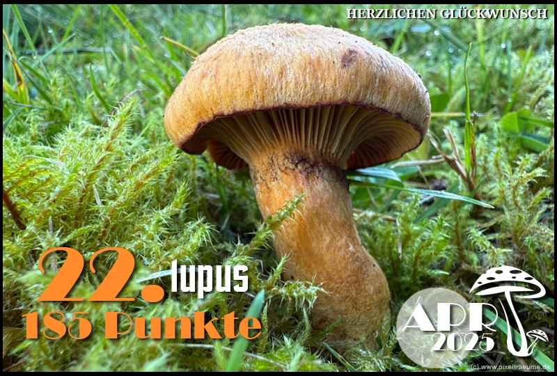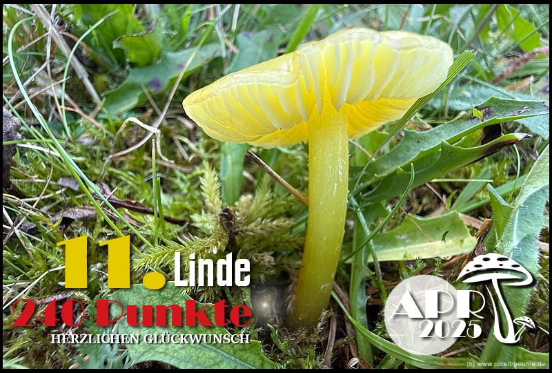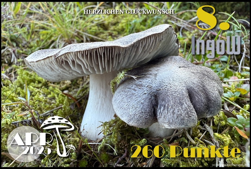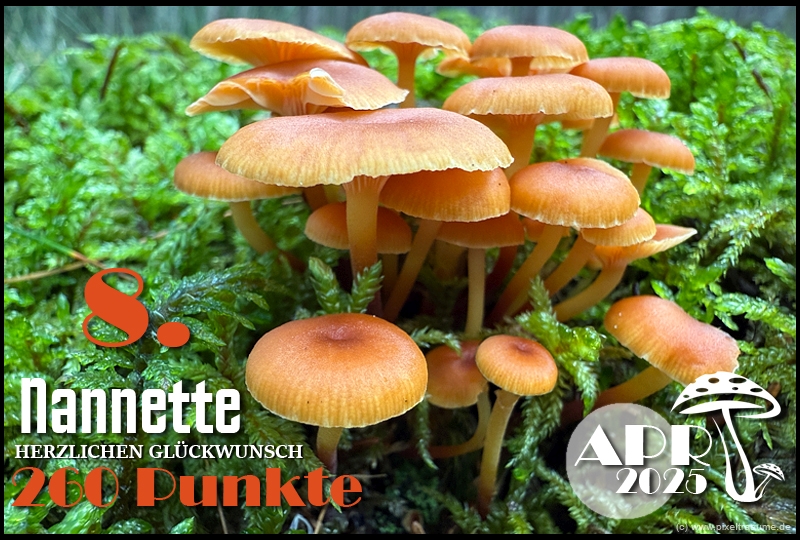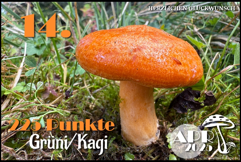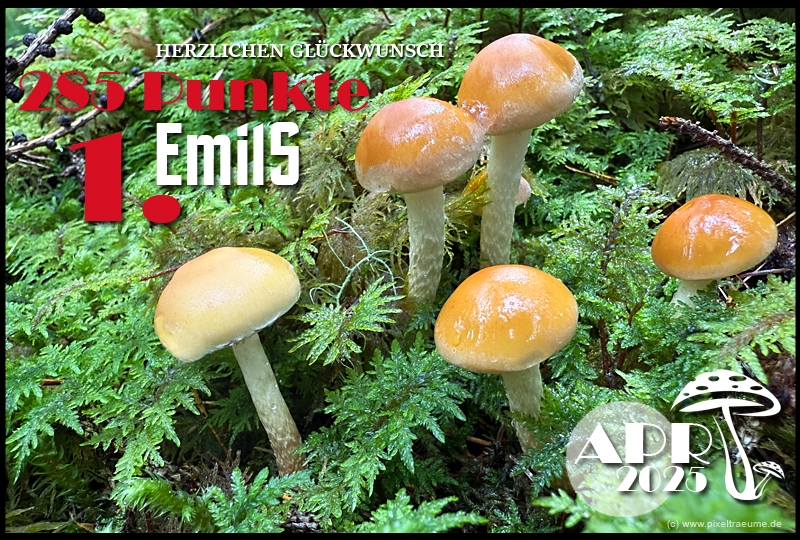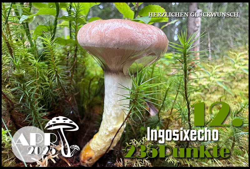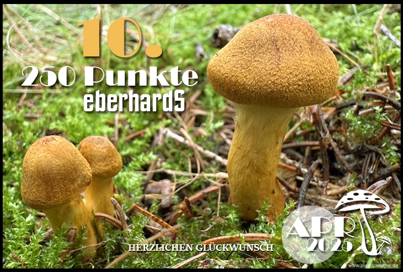 Pilzchips: 120 + 11 (3. Platz APR 22) + 8 (Landungswette APR 22) + 3 (Gastfreundlichkeitsbonus APR 22) + 7 (Phal APR 22) + 2 (Phal APR 22) + 4 (lustigphalsche Phalinterpretation APR 22) = 155 - 20 (APR 23) = 135 + 6 (4. Platz APR 23) + 8 (Platzierungswette APR 23) + 5 (drittbester Phal APR 23) + 3 (Gnolmcollage APR 23) + 4 (Landungswette APR 23) + 3 (Bonus Gastfreundlichkeit APR 23) = 164 - 20 (APR 24) = 144 + 9 (4. Platz APR 24) + 8 (Platzierungswette APR 24) + 3 (am nächsten an 250 Punkten APR 24) + 4 (Phäle APR 24) + 5 (Landungswette APR 24) = 173 - 20 (APR 25) = 153