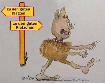 Heut früh waren alle Kissen um die Kischd im Weinkeller verteilt, die Kekse weggekrümelt, in der Kischd lag ein orangener Zettel:" Kisch g'müdlich isch, leider wenig Gnekse da, Schinken auch nicht. Besser Sommerschlaf bei andre Gnolme. Bitte ganz viiiieeeel Gnekse backa und Kischd in Lieblingsfarb anstreiche, vielleicht komme dann wieder"