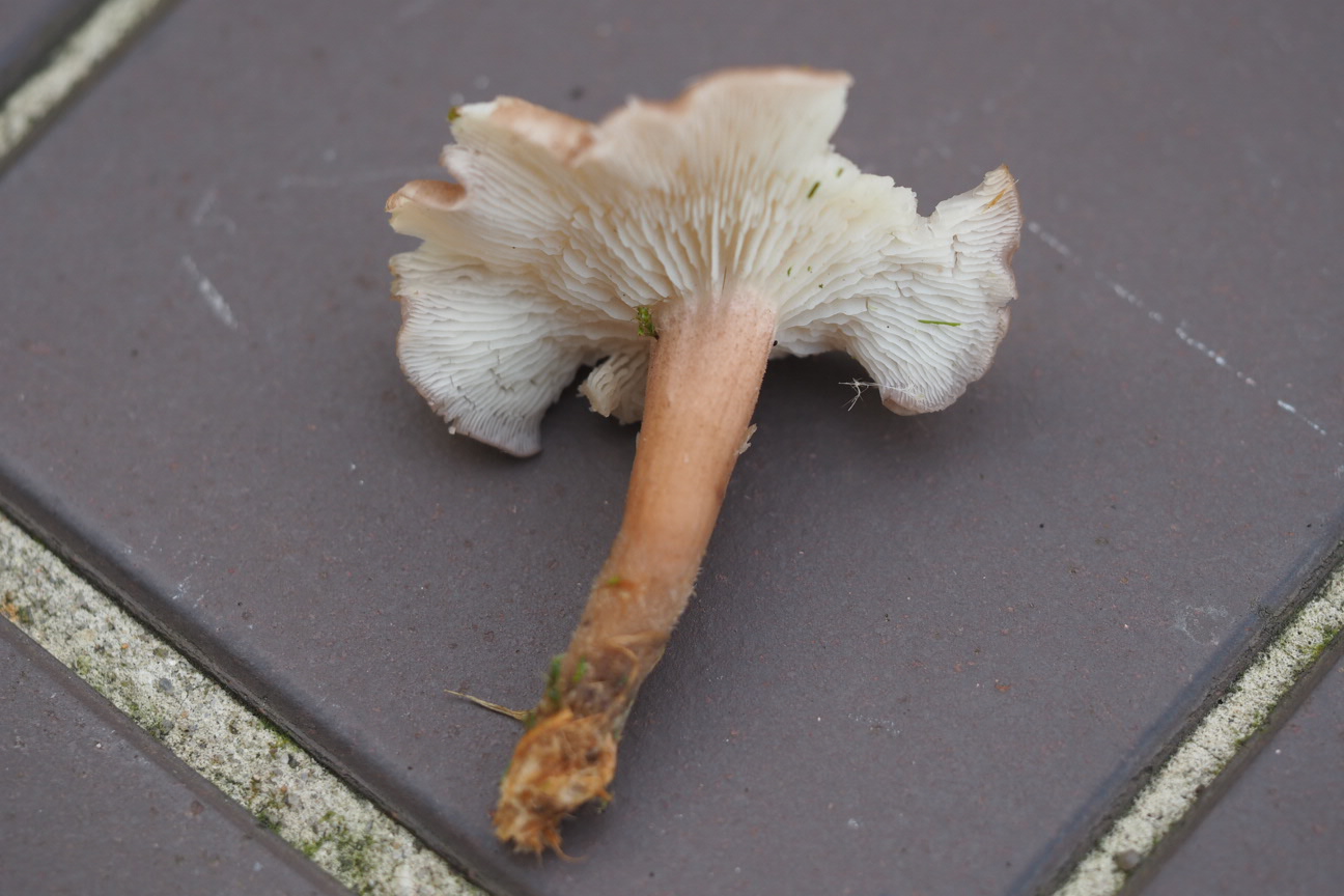 Bild 3: FK von unten / seitlich, nach unten verjüngter Stiel in Hutfarbe, Lamellen angewachsen