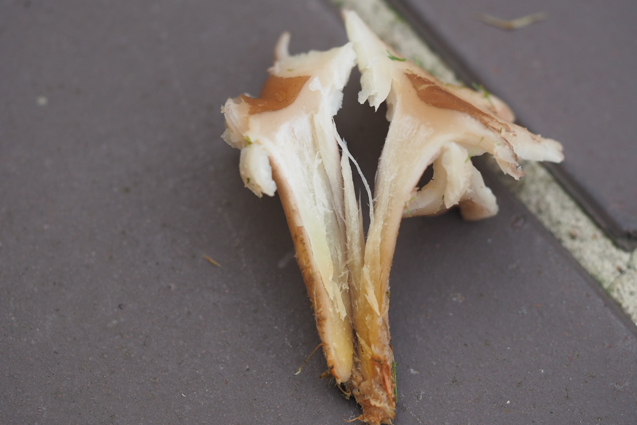 Bild 4: Durchgeschnittener FK mit sehr faserigem hohlen Stiel, weißes Stielfleisch, baige-weißes Hutfleisch
