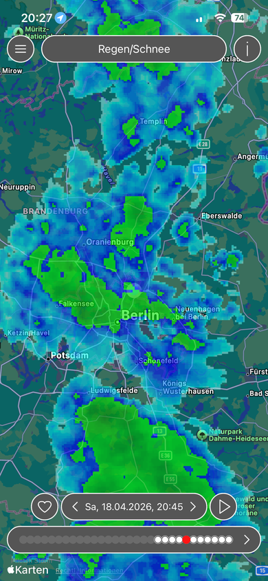 für den Berliner Raum sieht es sehr gut aus. Dass die Front zu weit nach Osten durchzieht, scheint wohl zunächst vom Tisch zu sein. Unsicher ist aber weiterhin, wo die Hauptniederschläge in der Nord-Süd Ausdehnung ihren Schwerpunkt haben und dann entsprechend zurückgeholt werden.