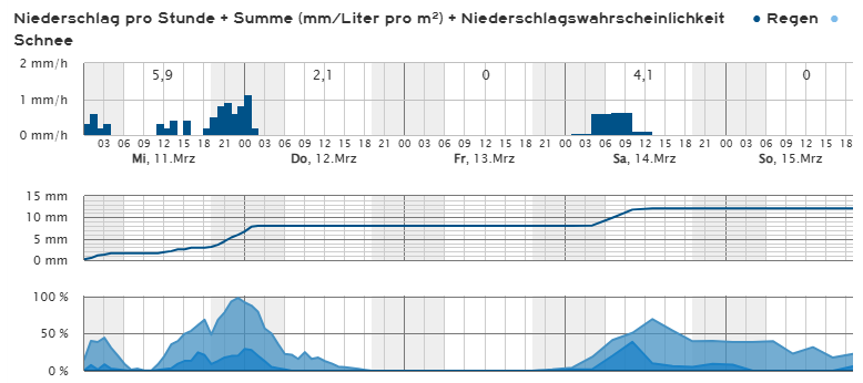 • Also, wenn alles gut läuft, und es tatsächlich so kommen sollte wie hier prognostiziert, dann suckeln bei uns bis zum Abschluss des Wochenendes 12,5 Liter Niederschlag runter: