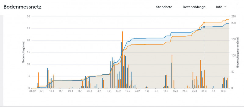 Hier waren es 4 L letzte Nacht. Mit dem Regen vom Wochenende sind es jetzt 8,5 Liter in Summe über 4 Tage hinweg. Das ist ganz in Ordnung.