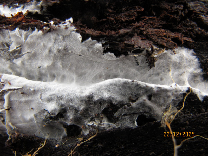 Auf der Unterseite einer Kirschbaum-Borke, in einem vor ca. 5 Jahren zum Verrotten abgelagerten Kirschbaum Altholzhaufen, in Nachbars Wiese.