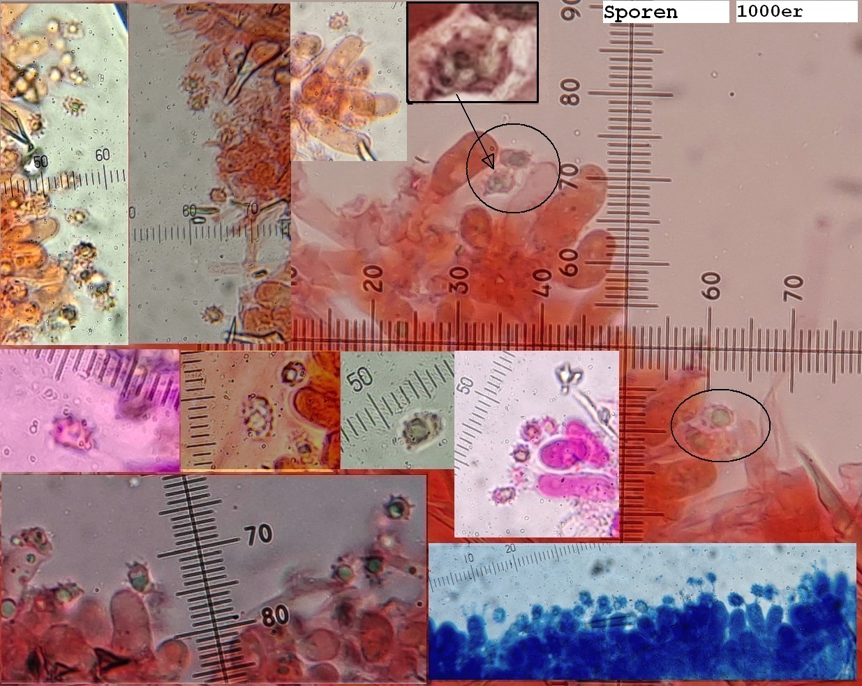 1*) Vor allem mein Sp. Foto ist farblich etwas zu bunt überladen. Ein Sp. Abwurf hat nicht funktioniert. Nur in Wasser oder KOH konnte ich die Strukturen der kleinen stacheligen Sporen kaum aussagefähig abbilden, so dass ich mit Einfärben nachhelfen musste.