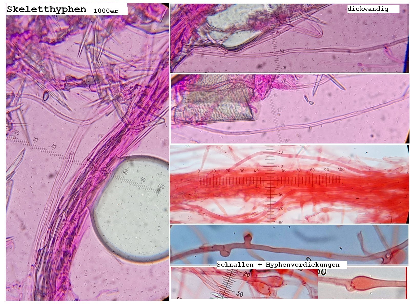 Dimitisch, mit verzweigten Hyphen, oft bis 8µm verdickt, mit Schnallen sowie dickwandigen Skeletthyphen bis 2,5 µm in den Hyphenbündeln.