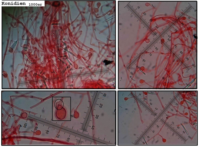 Konidien 4-7x4-6µm dünnwandig (bis schwach dickwandig) kugelig bis fast kugelig mit gut ausgebildeten Schnallen an kurzen, dünnen Hyphenfäden.