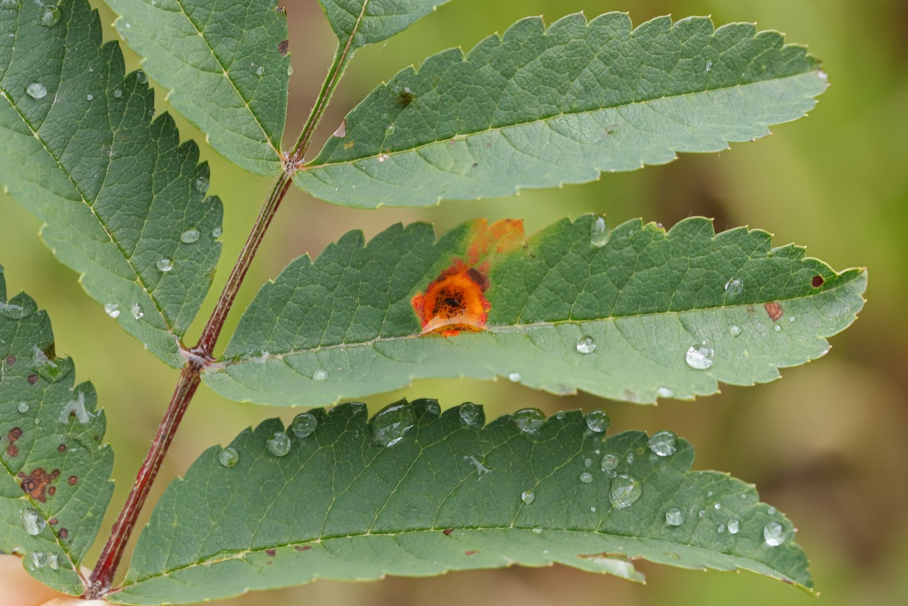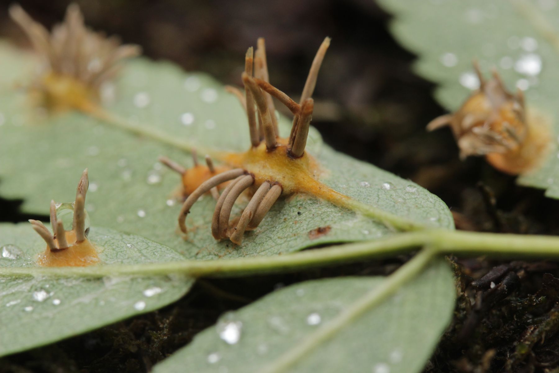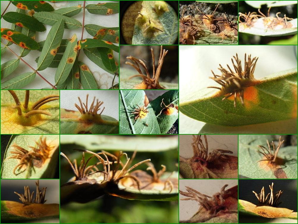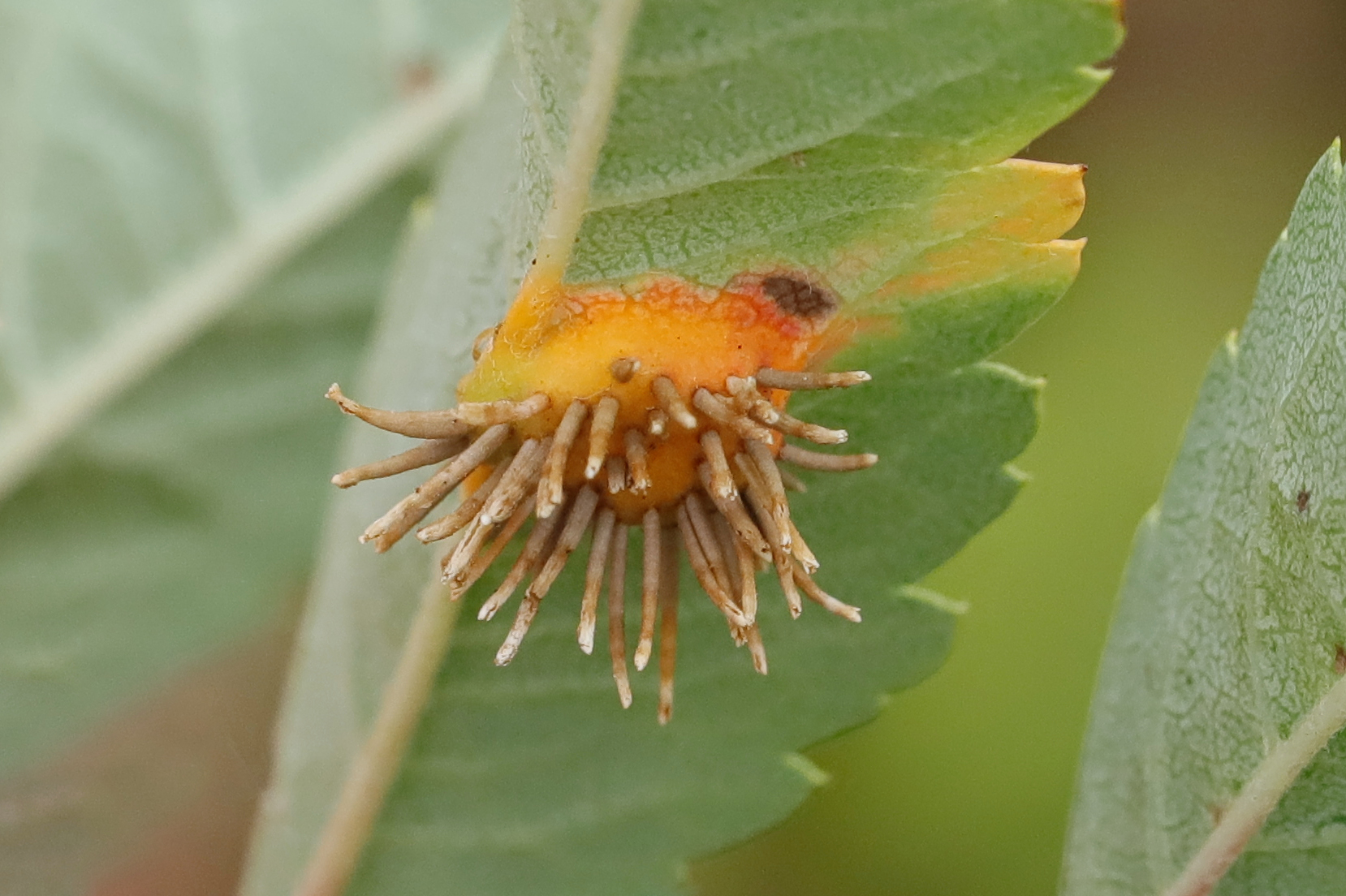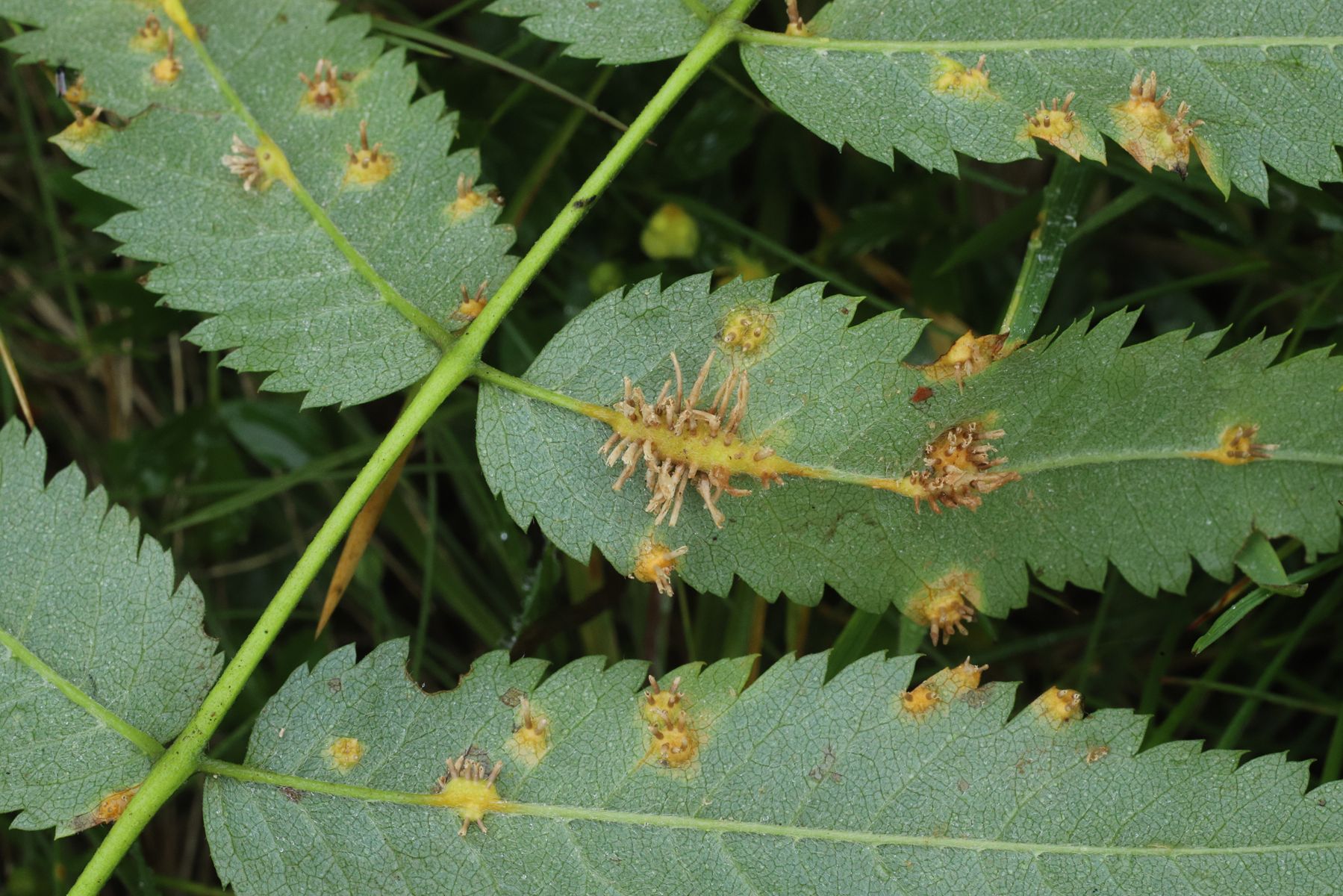 der Ebereschenrost Gymnosporangium cornutum aus Österreich, Bundesland Salzburg, Salzburger Schieferalpen, Maria Alm, Berg Natrun, 1160 m, 17.08.2025. Auf der Blattoberseite von Eberesche Sorbus aucuparia fallen nur kleine, rote Flecke auf, aber die Blattunterseite zeigt "Hörnchen" von magischer Schönheit.