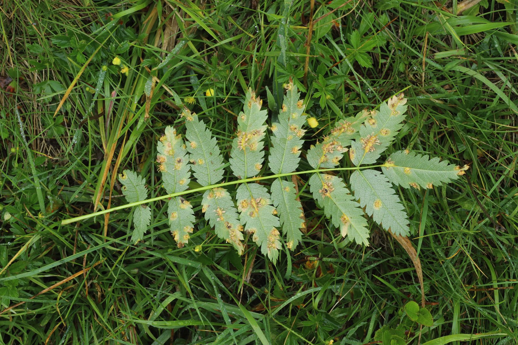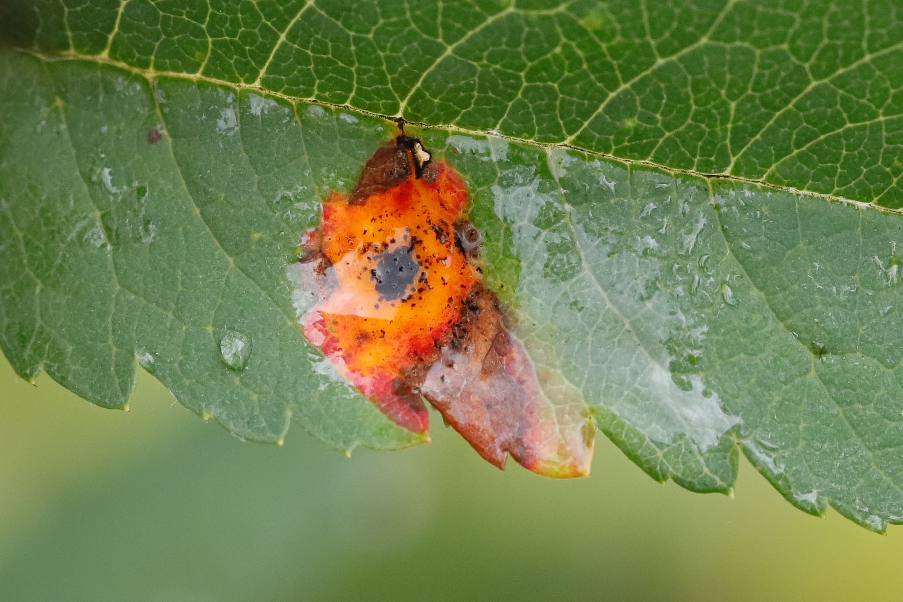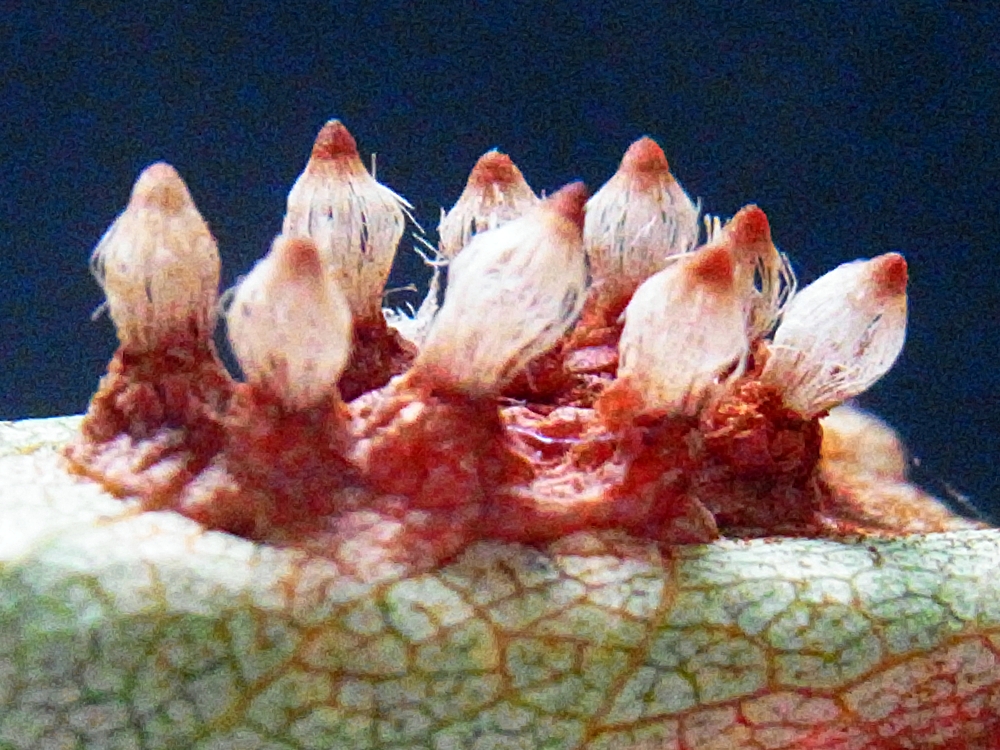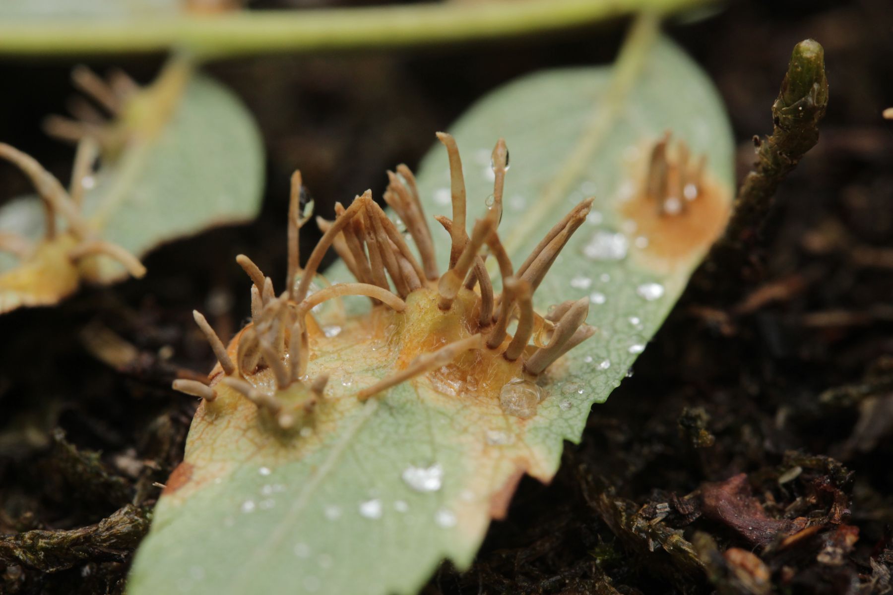 der Ebereschenrost Gymnosporangium cornutum aus Österreich, Bundesland Salzburg, Salzburger Schieferalpen, Maria Alm, Berg Natrun, 1160 m, 17.08.2025. Auf der Blattoberseite von Eberesche Sorbus aucuparia fallen nur kleine, rote Flecke auf, aber die Blattunterseite zeigt "Hörnchen" von magischer Schönheit.