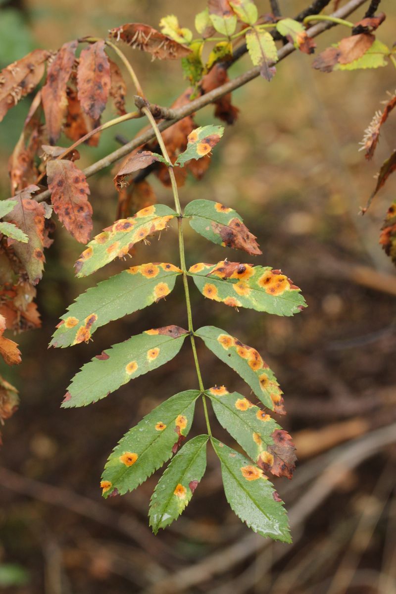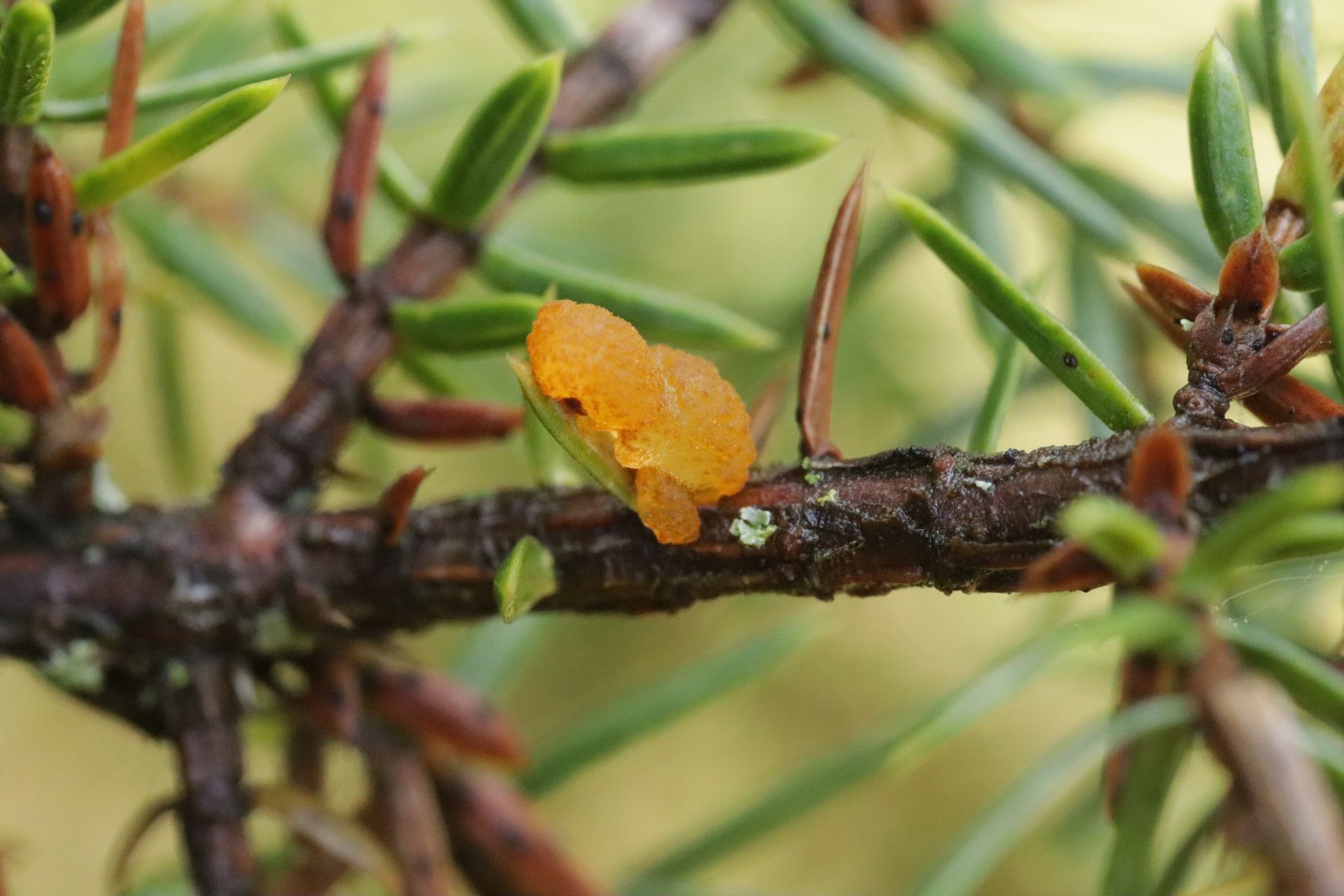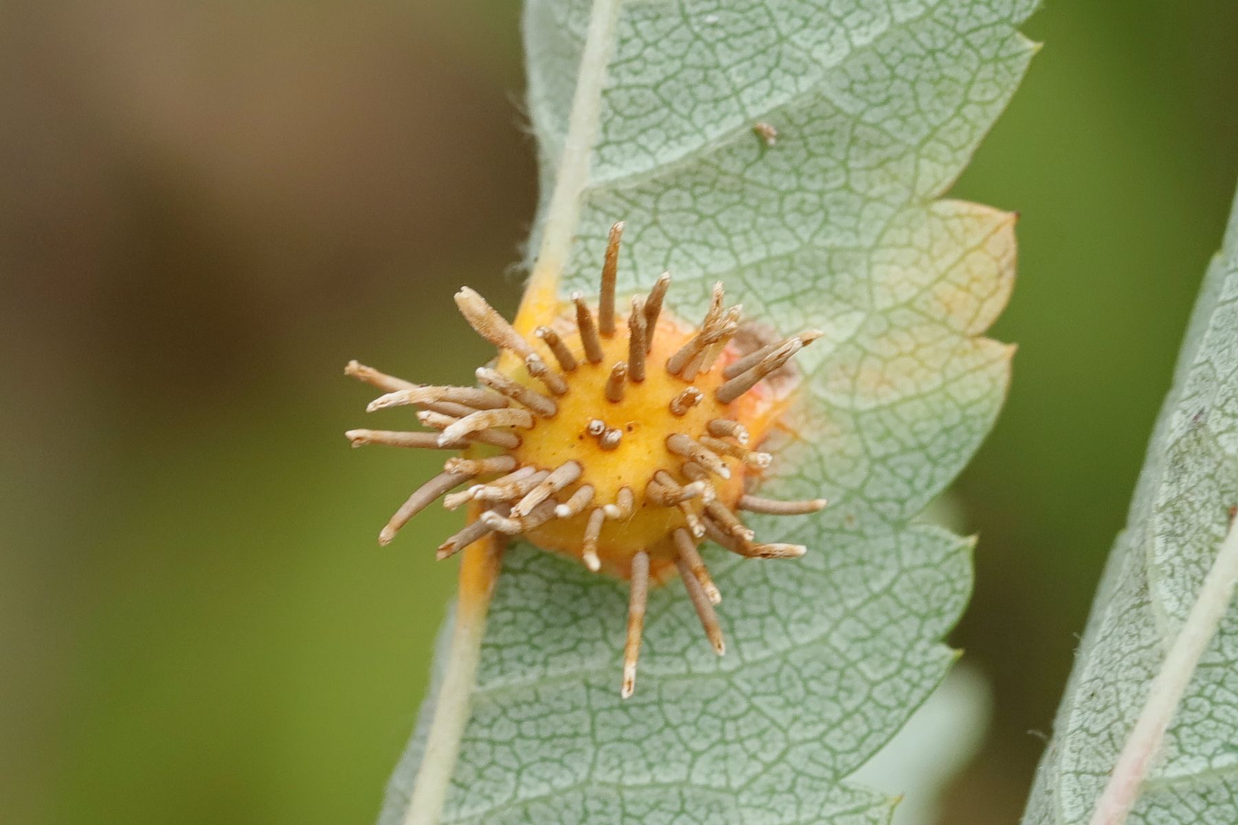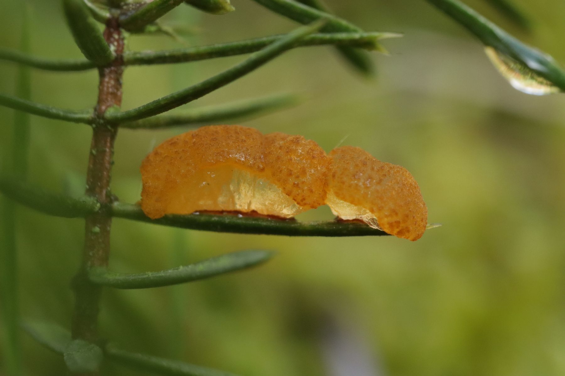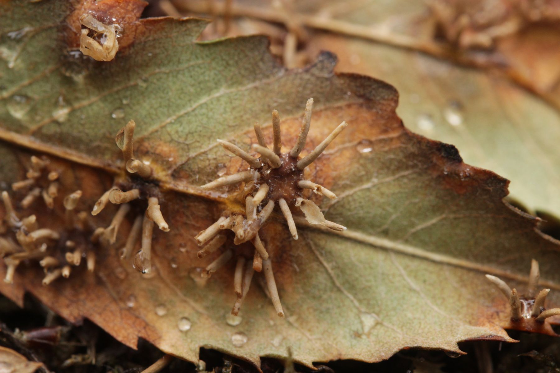 der Ebereschenrost Gymnosporangium cornutum aus Österreich, Bundesland Salzburg, Salzburger Schieferalpen, Maria Alm, Berg Natrun, 1160 m, 17.08.2025. Auf der Blattoberseite von Eberesche Sorbus aucuparia fallen nur kleine, rote Flecke auf, aber die Blattunterseite zeigt "Hörnchen" von magischer Schönheit.