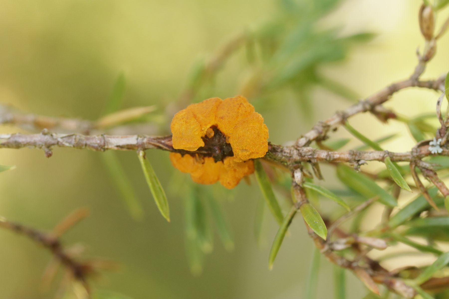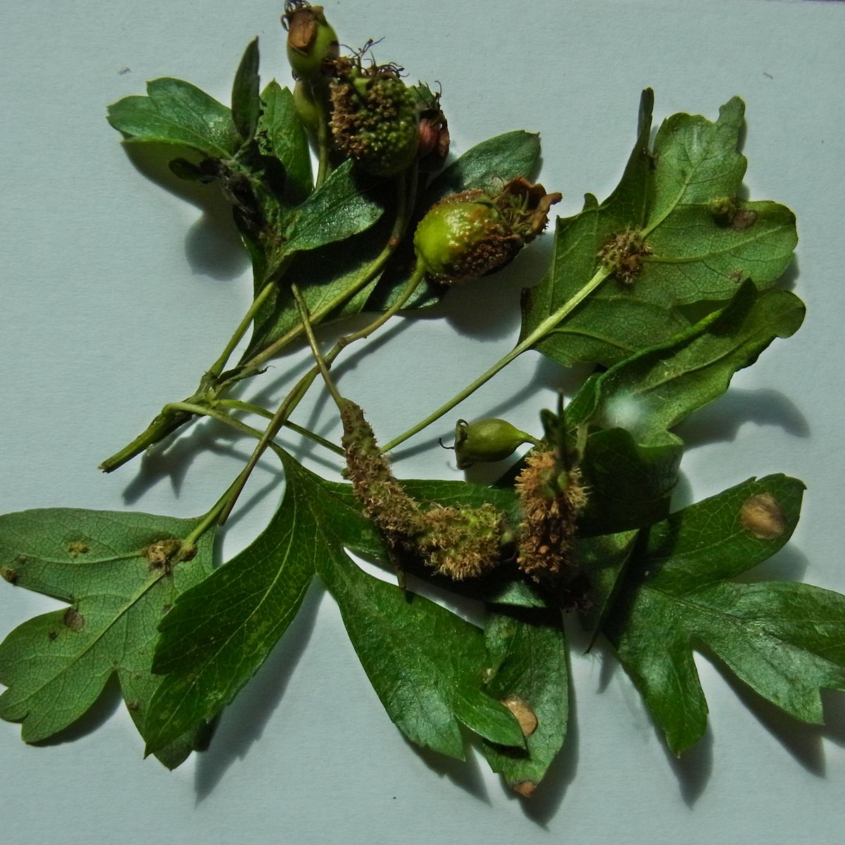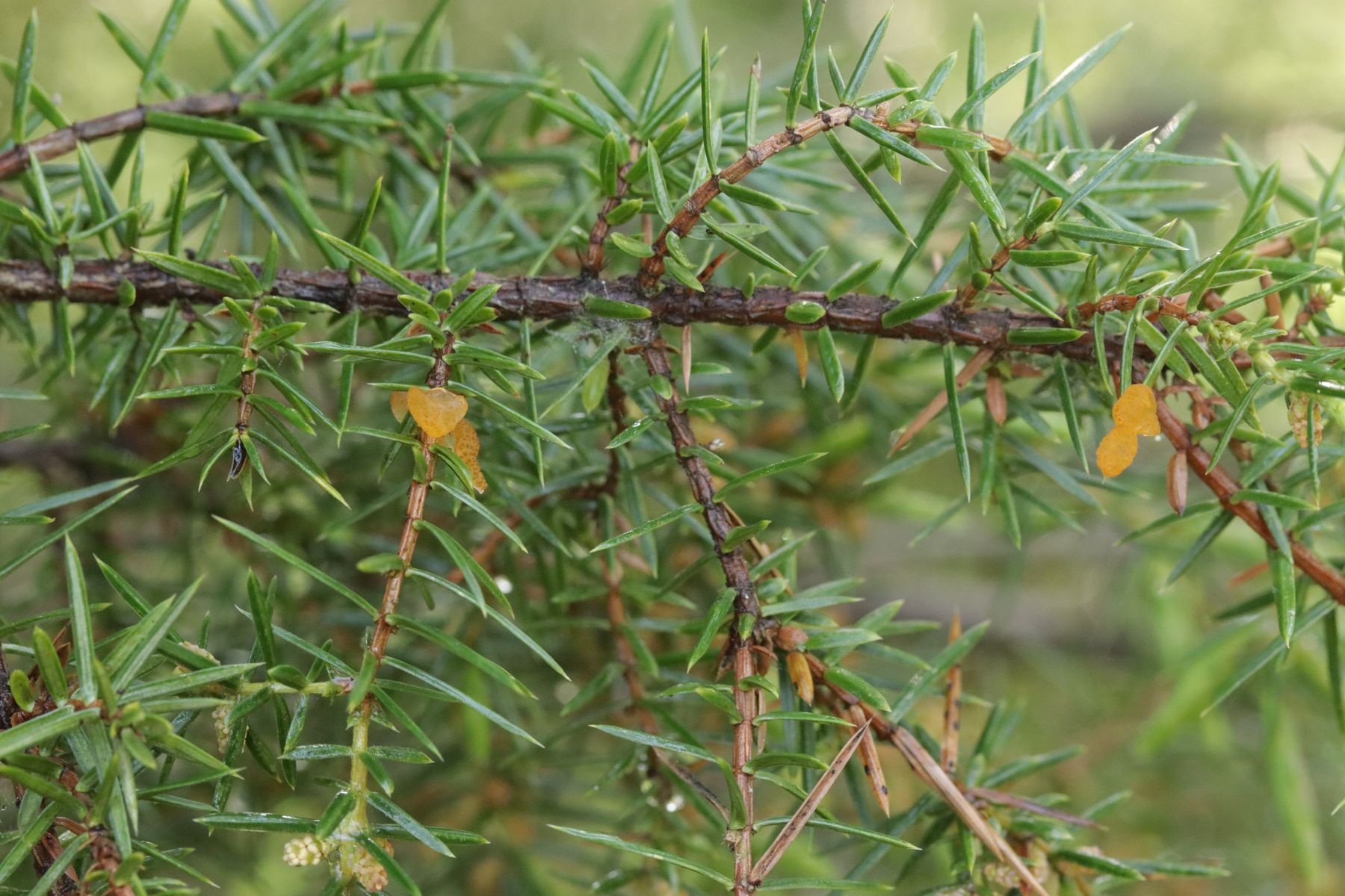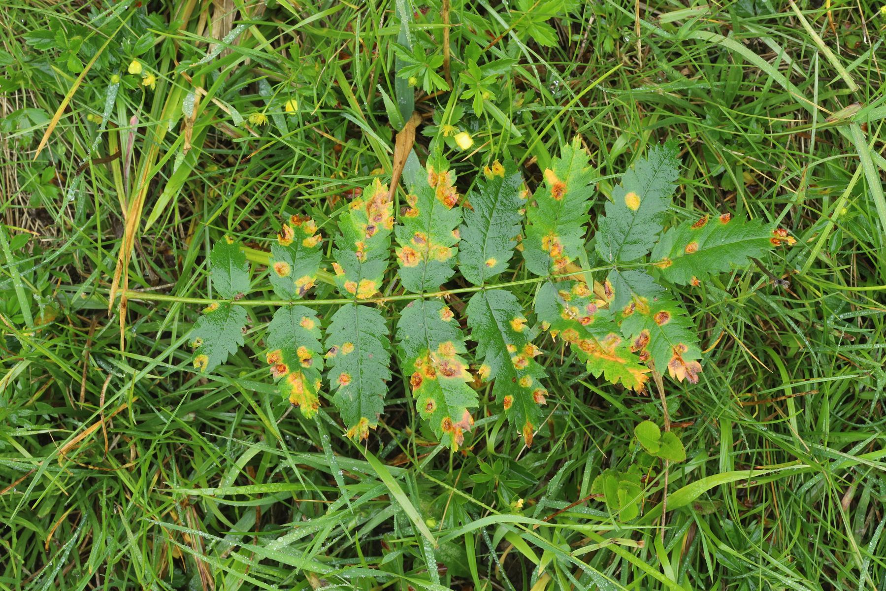der Ebereschenrost Gymnosporangium cornutum aus Österreich, Bundesland Salzburg, Salzburger Schieferalpen, Maria Alm, Berg Natrun, 1160 m, 17.08.2025. Auf der Blattoberseite von Eberesche Sorbus aucuparia fallen nur kleine, rote Flecke auf, aber die Blattunterseite zeigt "Hörnchen" von magischer Schönheit.