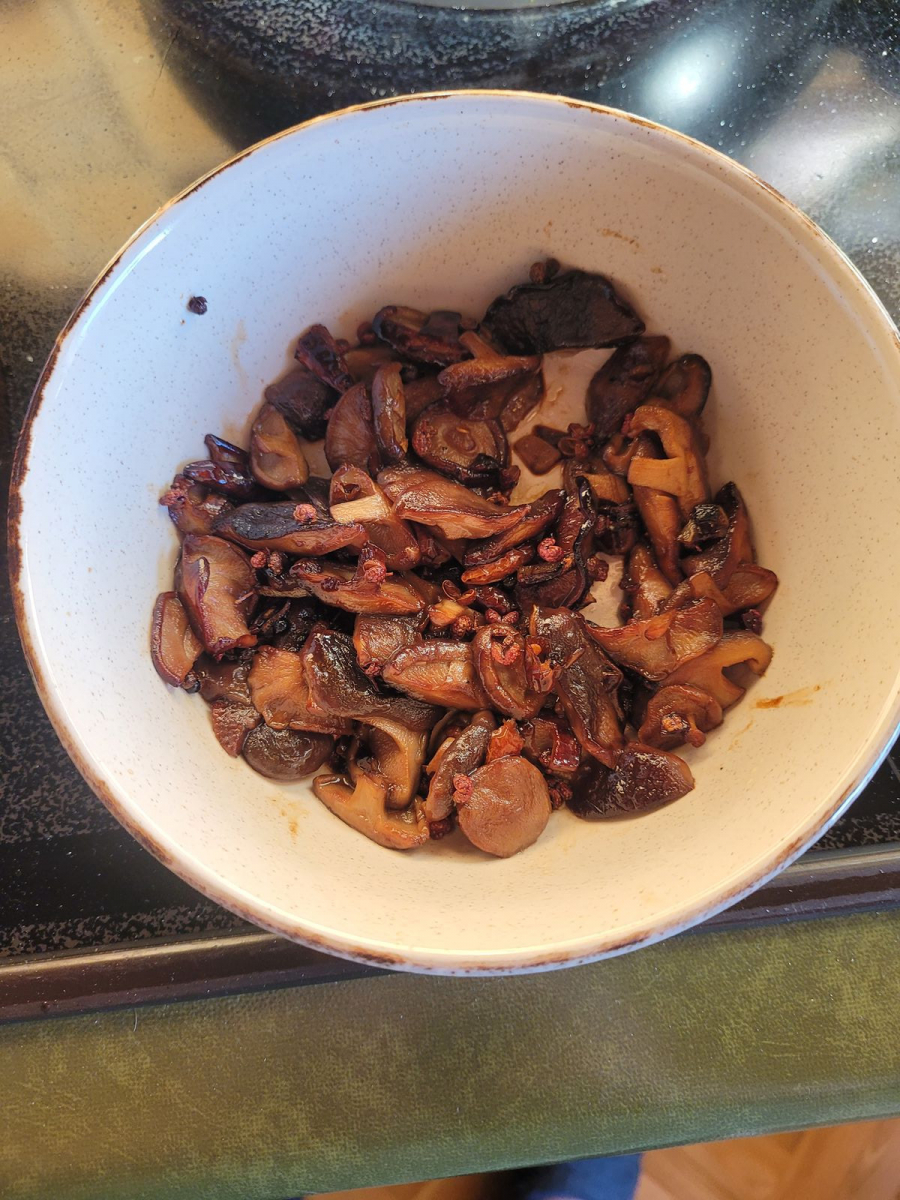 Ich liebe den Geschmack. Der Shiitakegeschmack bleibt erhalten, der Knoblauch unterstützt ihn, Mirin gibt etwas Süße, die Sojasauce etwas Salzigkeit und Umami, die Pilze sind eh sehr geschmackig, der Szechuanpfeffer gibt etwas Zitronigkeit dazu (und das unnachahmliche Gefühl beim Essen) und die Bird Eye Chillies sind nicht zu scharf, aber geben den Pilzen etwas Wumms. Ich liebe es.