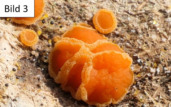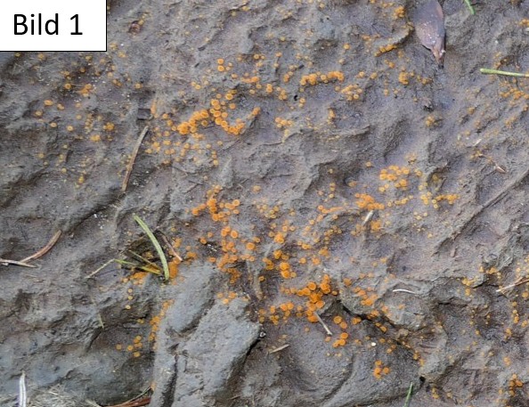 Im Oktober 2025 bin ich über eine Kuhweide gelaufen mit vielen Dunghaufen. Jeder, den ich fand, hatte einen gelbe «Verzierung» (Bild 1). Es waren kleine gelb/orange, gallertige Becherchen mit max. 5 mm Durchmesser. Der Rand ist körnig und die stiellosen Fruchtkörper wachsen teilweise eng ineinander. Beim genauen Betrachten und etwas Recherchieren bin ich beim Namen Körniger Rinderdungbecherling (COPROBIA GRANULATA) gelandet (siehe Bild 2 und 3). Ich hoffe das stimmt - trotz fehlender Mikroskopie - sonst wäre ich um Korrektur sehr froh.