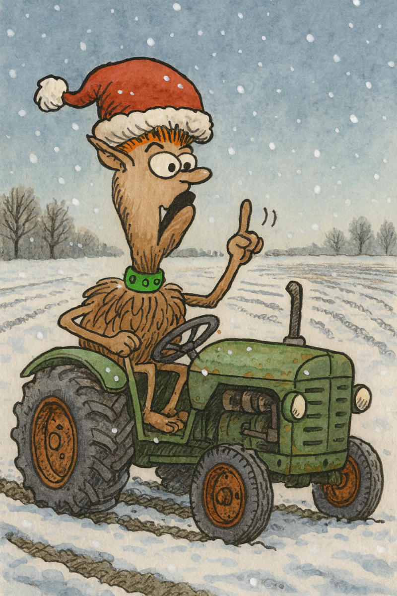 Gnolmimi auf Traktor (Gerät, wo man eine Egge dran befestigen kann, auf (milch)weißem Schnee)