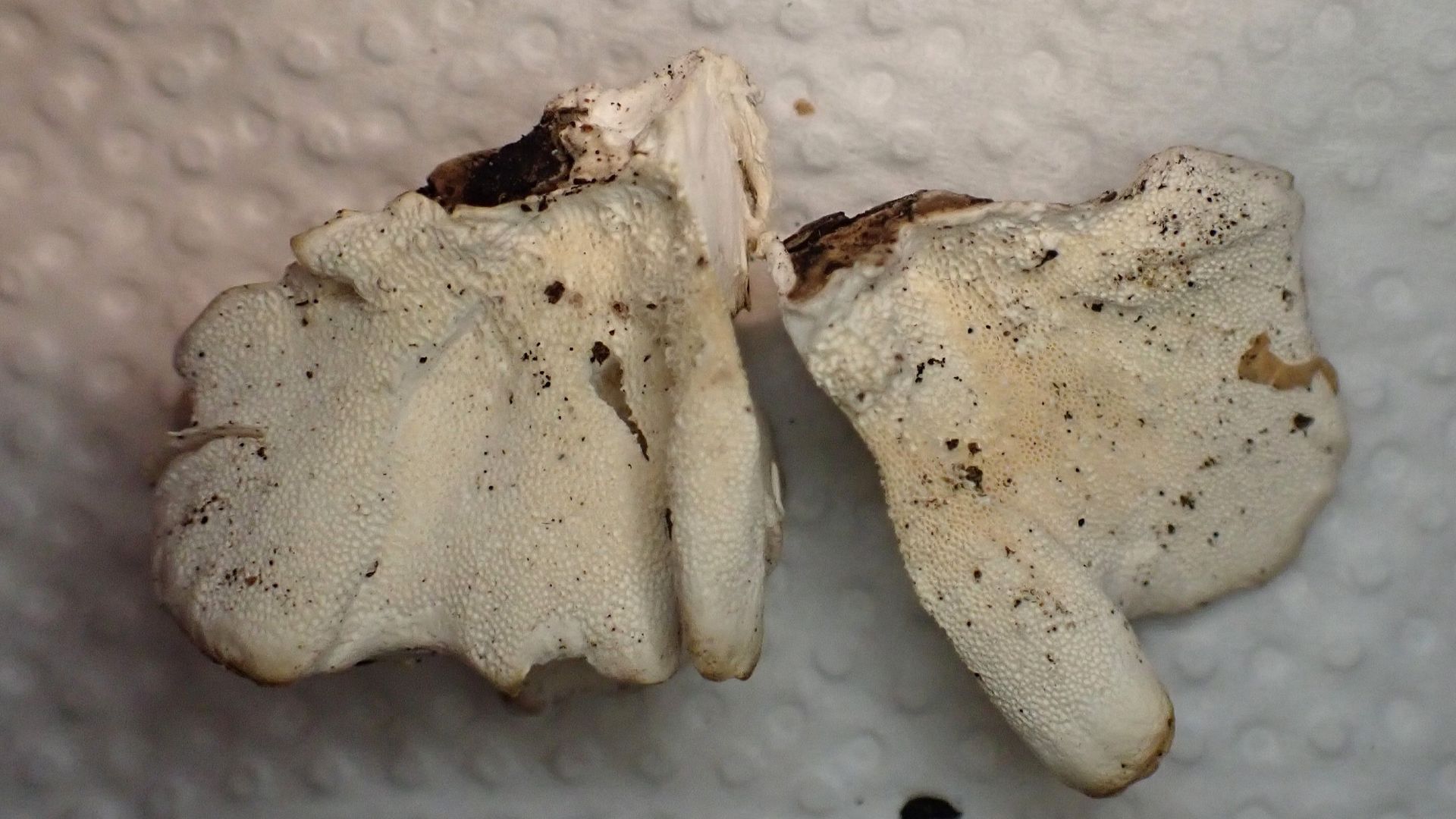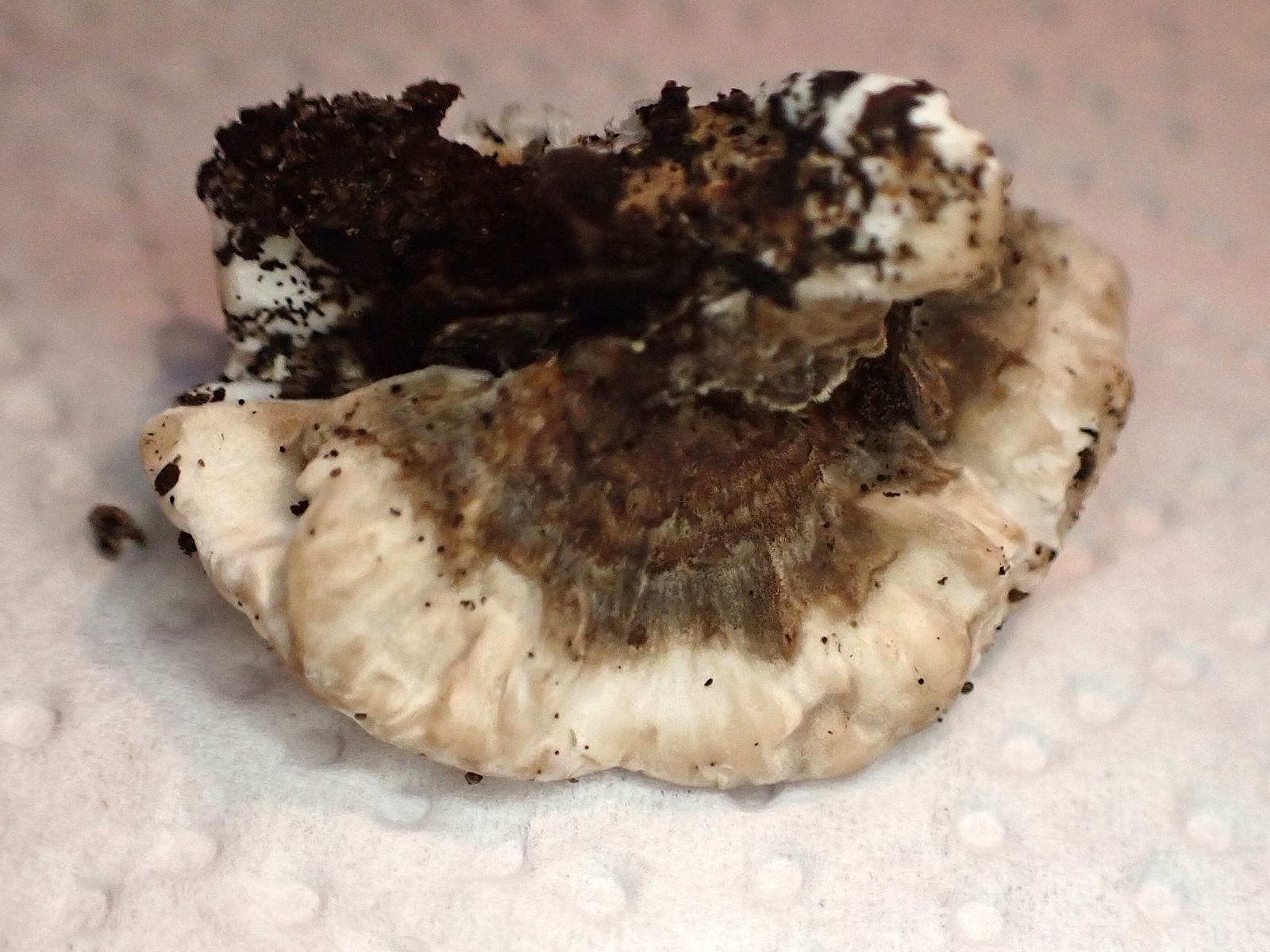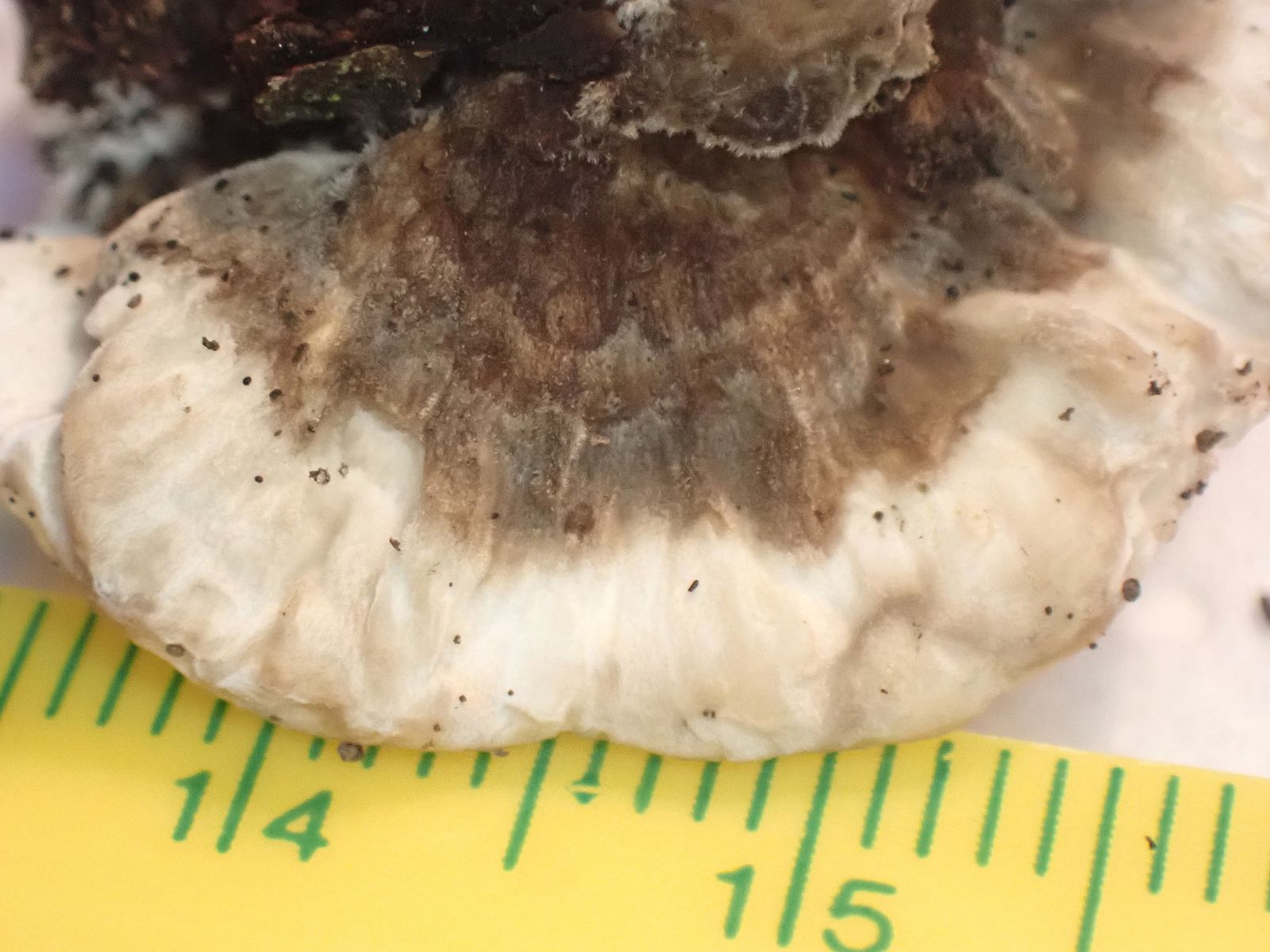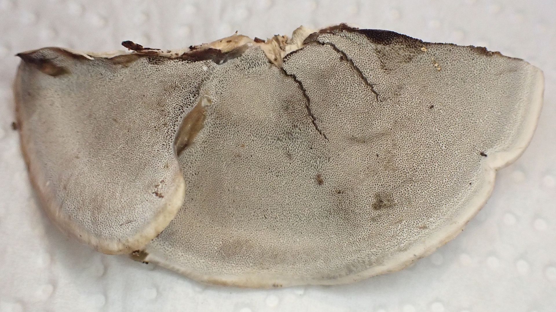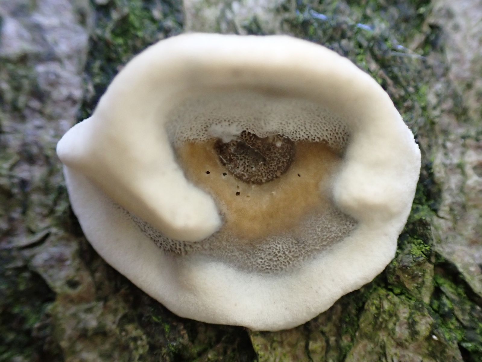 Zugegeben, der Angebrannte Rauchporling hätte in diesem Fall ähnliche Hutfarben, aber der kriegt ziemlich schnell ein braunes oder graues Zentrum in der Fruchtschicht.