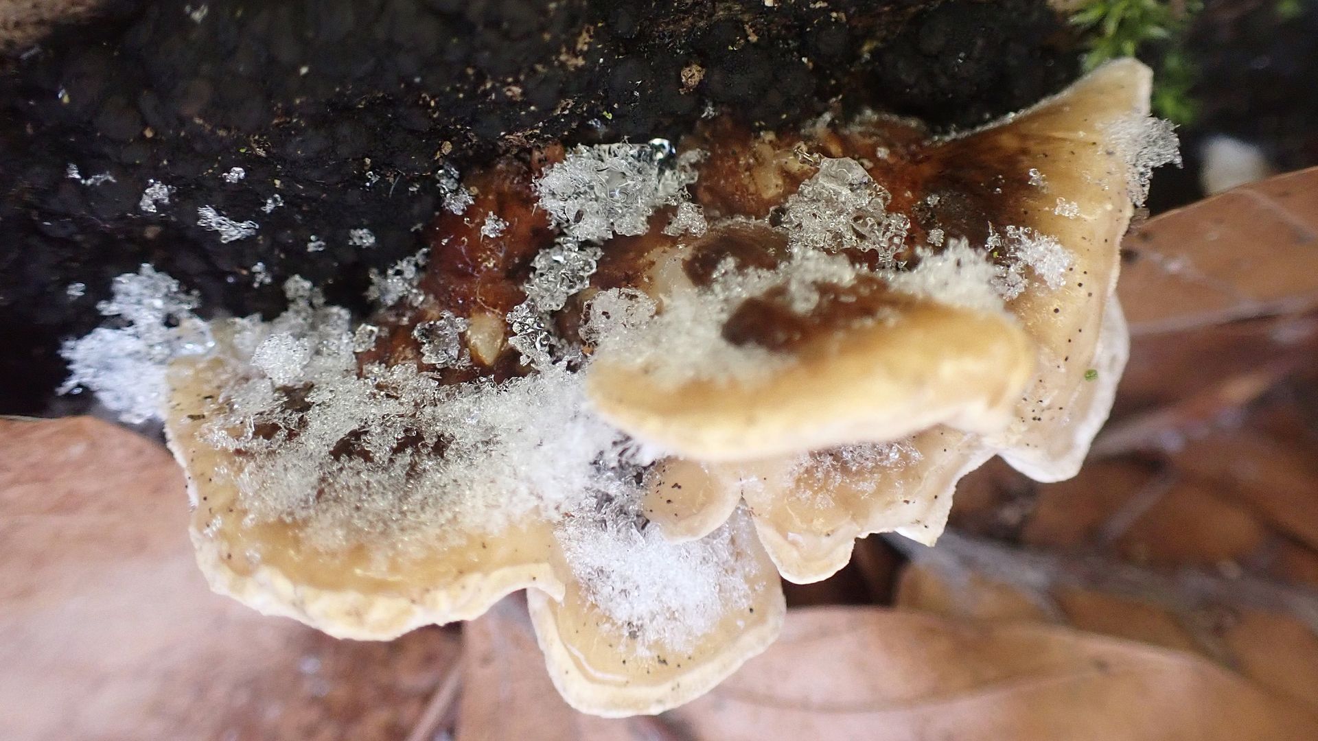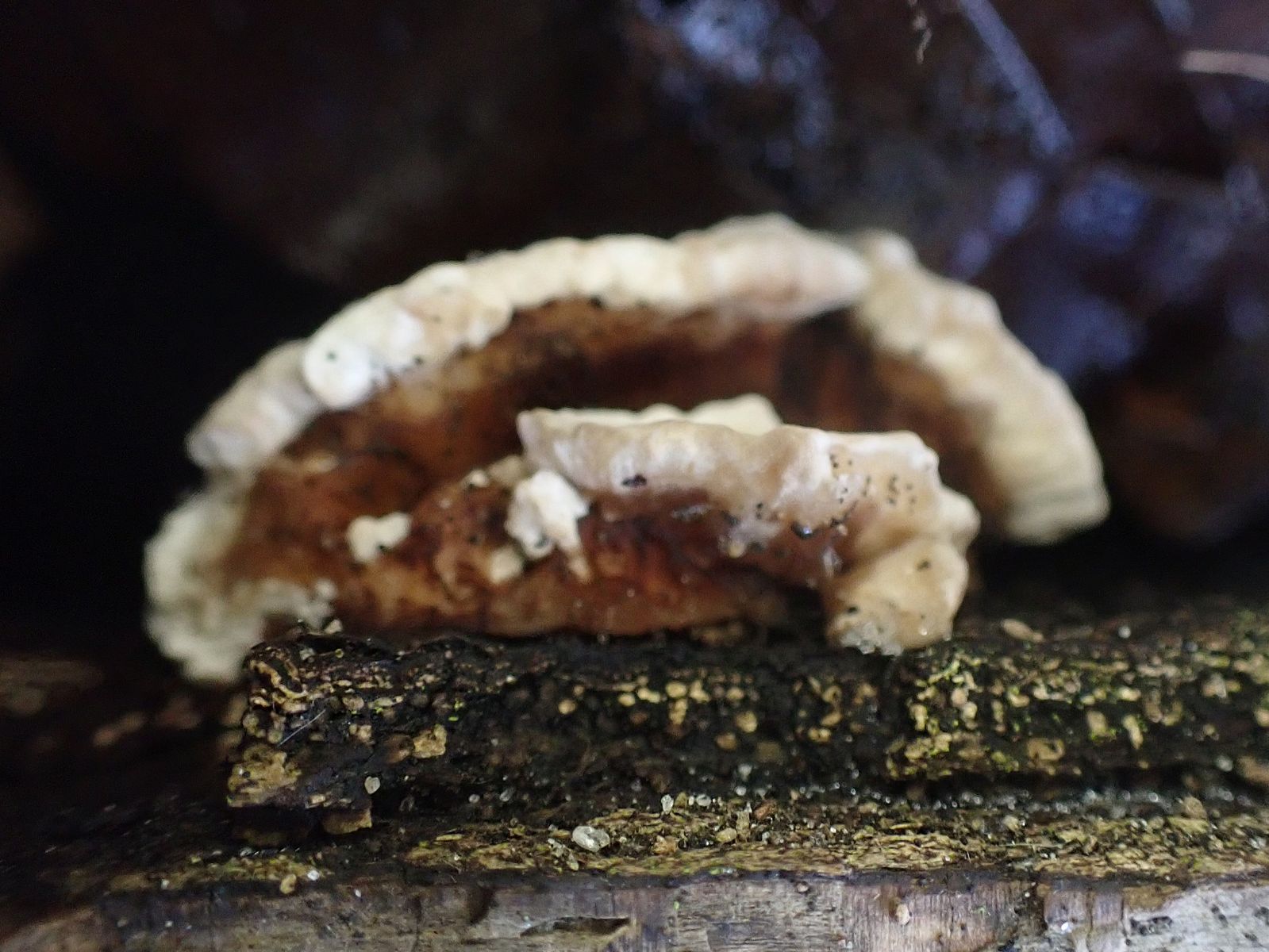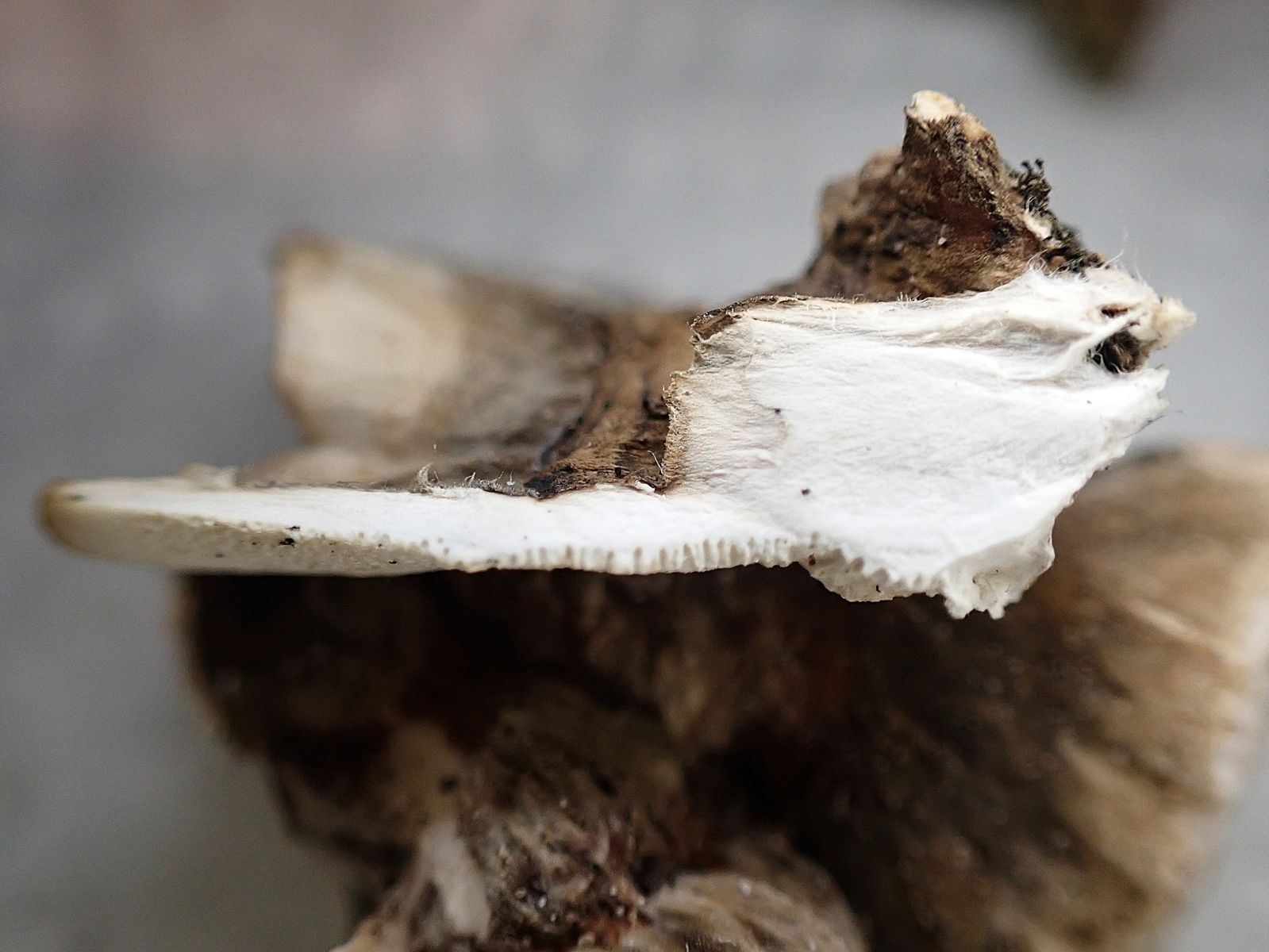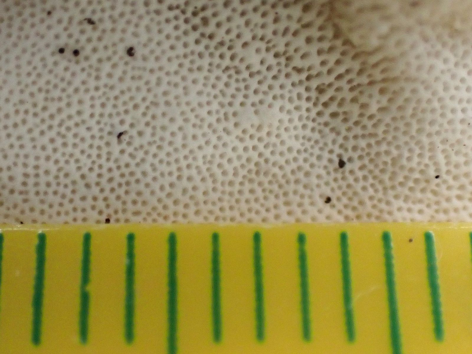 Zugegeben, der Angebrannte Rauchporling hätte in diesem Fall ähnliche Hutfarben, aber der kriegt ziemlich schnell ein braunes oder graues Zentrum in der Fruchtschicht.