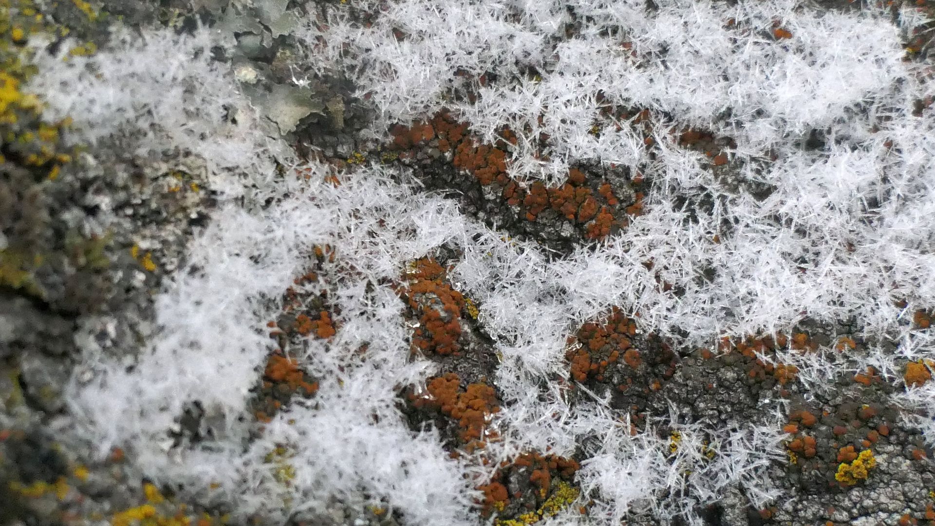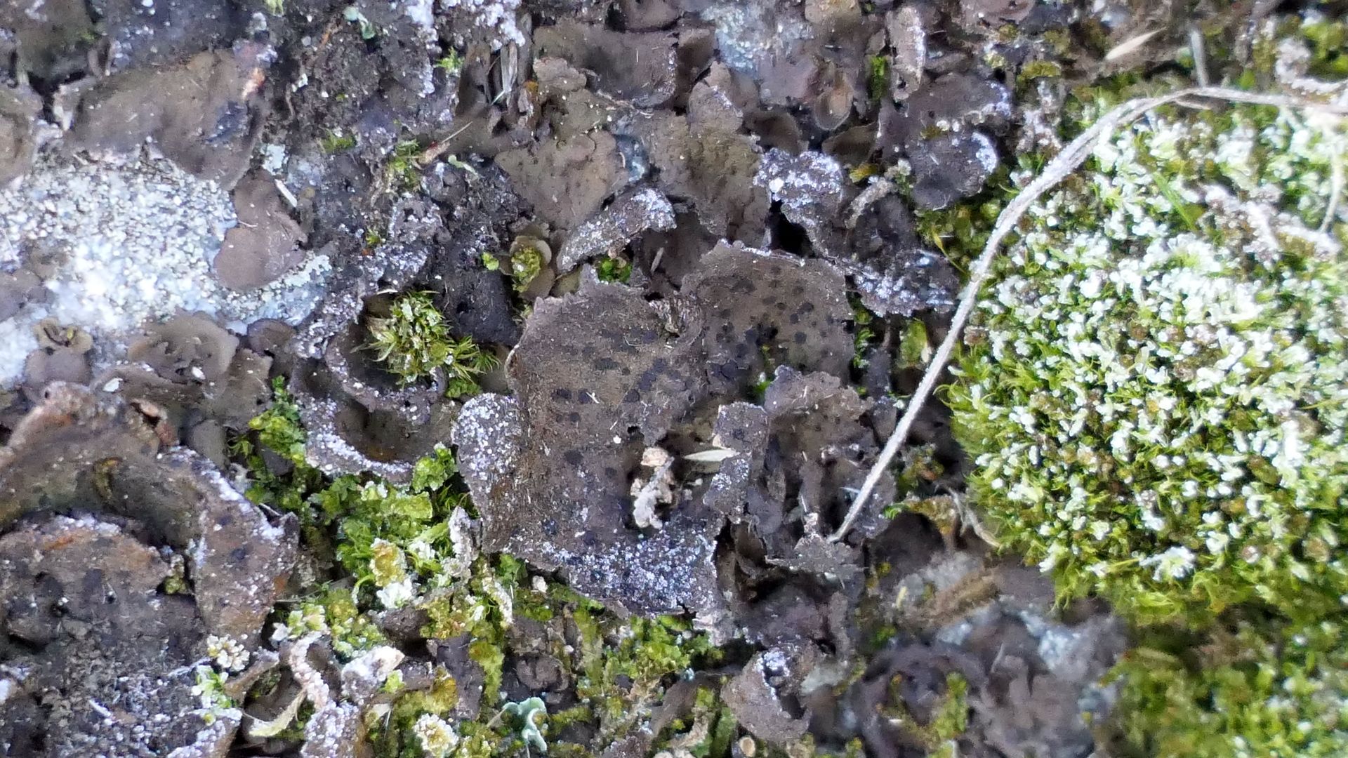 Bild 3 Fruchtende Umbilicaria deusta in Mengen, mit Raureif überzogen