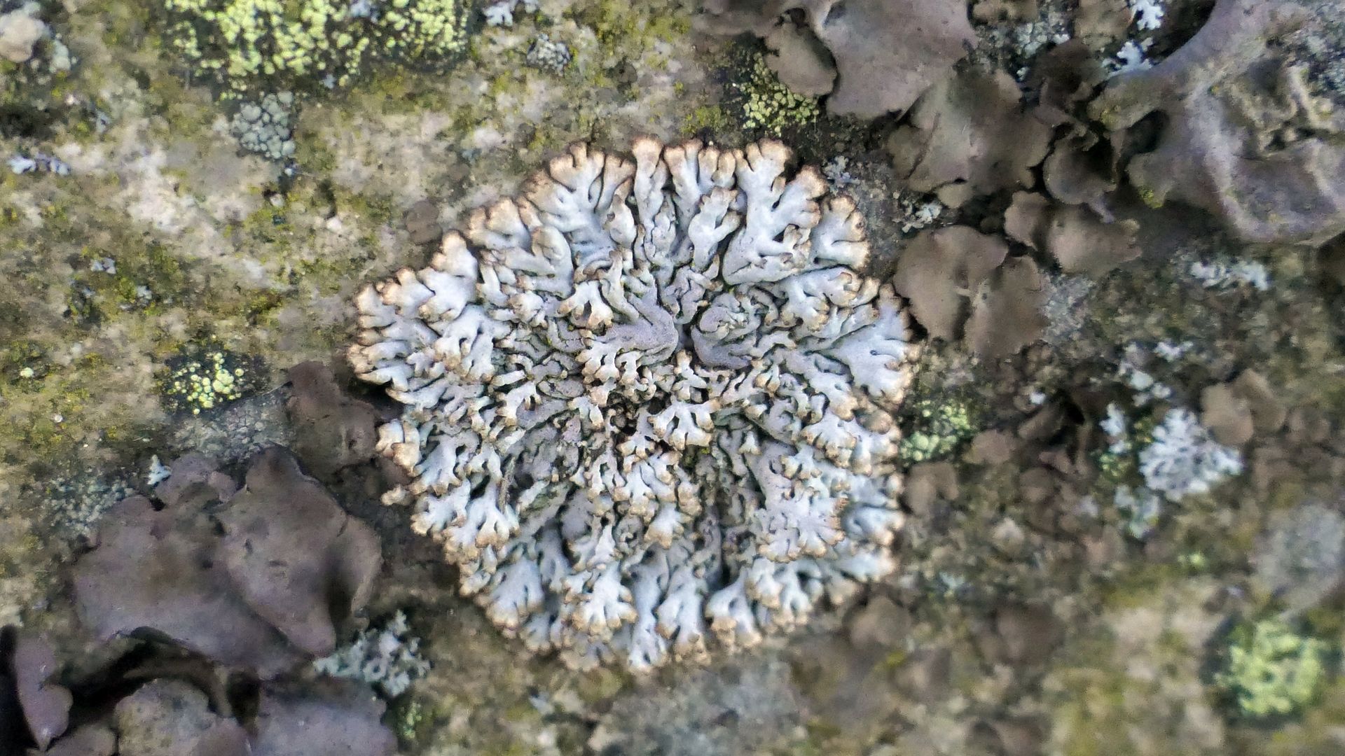Bild 5 Erinnert an Hypogymnia, ist aber schmallappiger, relativ dicht anliegend, nicht hohl, Enden gebräunt und nicht an Rinde wachsend: