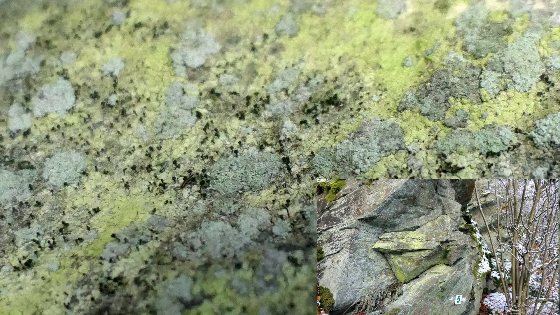Bild 13 Psilolechia lucida (Bildeinsatz, auf Silikat) kann von der unbereiften, schwarzen Microcalicum arenarium befallen werden. Leider ist meine Probe dieser Stecknadelflechte verschollen.