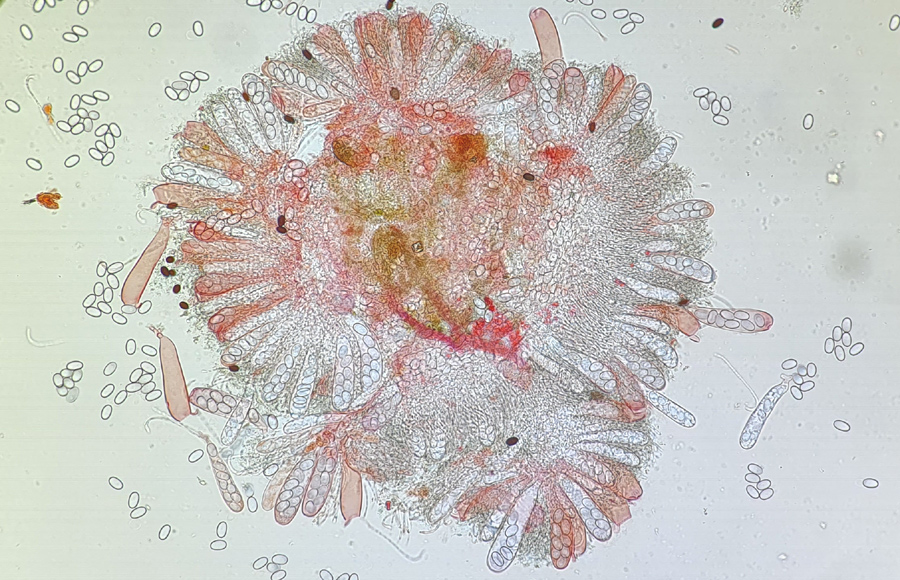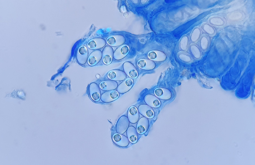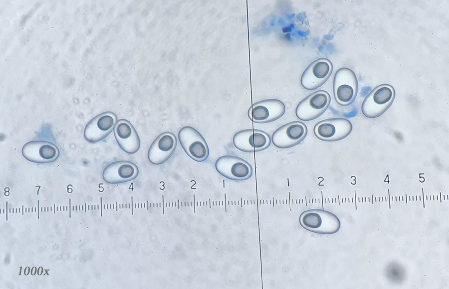 Ascosporen elliptisch, glatt, in Baumwollblau mit de Bary Tropfen, der aber erst spät (nach einem Tag) erscheint. Sporengröße: 10-12,5 x 6,5-7,5 µm.