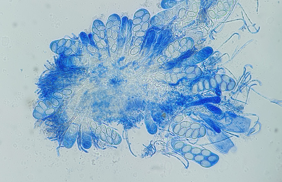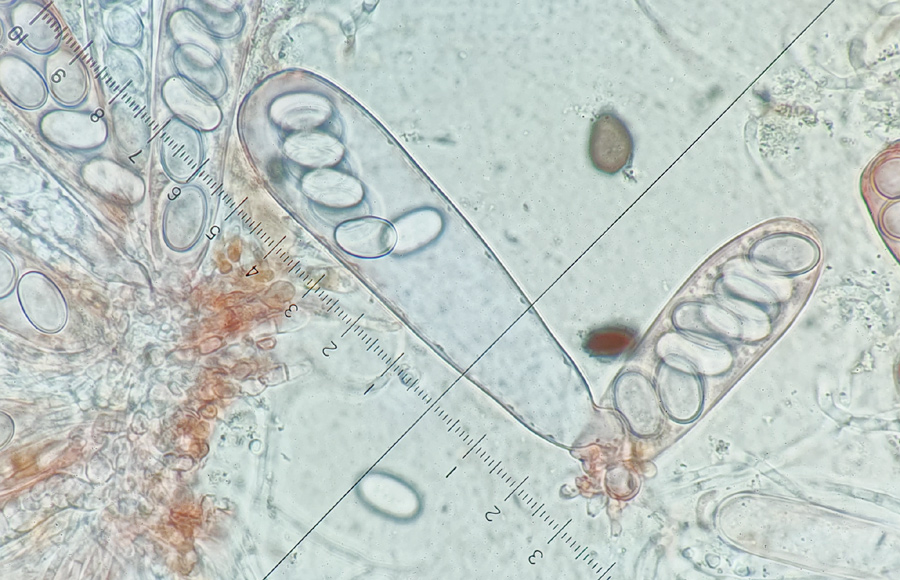 Asci breitzylindrisch (65) 70-85 (90) x 14-20 µm. Ascusbasis mit Haken.