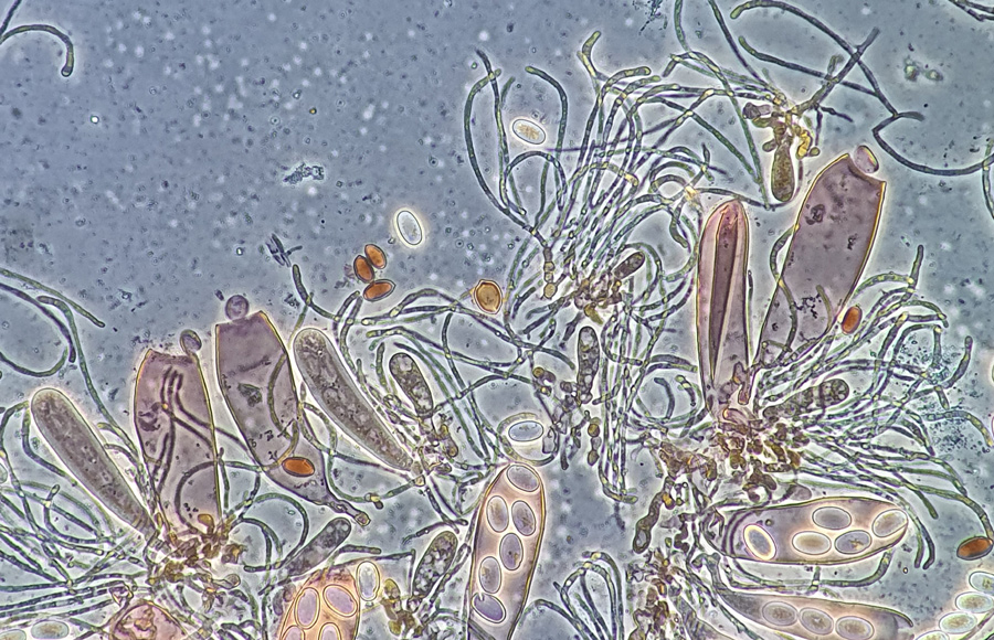 waren die die Asci kleiner, mehr breitkeulig bis breitzylindrisch und die Sporen in den Asci durchwegs biseriat angeordnet. Die Paraphysen oft stark gekrümmt,