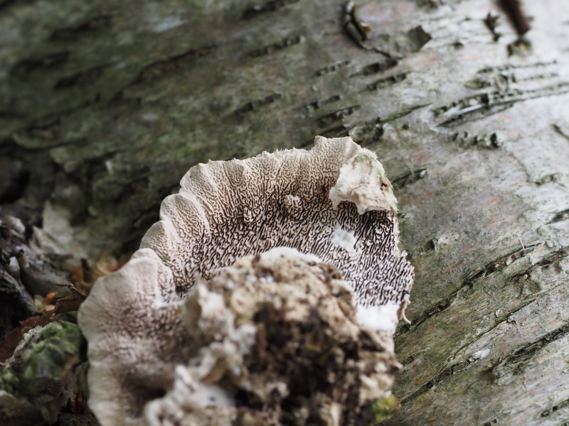 Anfang August habe ich in meinem Revier in einem kleinen anmoorigen Feldgehölz auf Birkenstumpf Pilze gefunden, die ich für den Aschgrauen Wirrling Cerrena unicolor halte. Ich bin mir da jedoch keineswegs sicher und hoffe hier auf Bestätigung oder andere Vorschläge.
