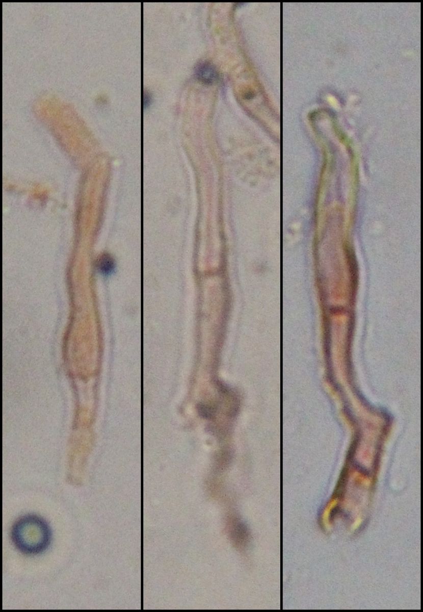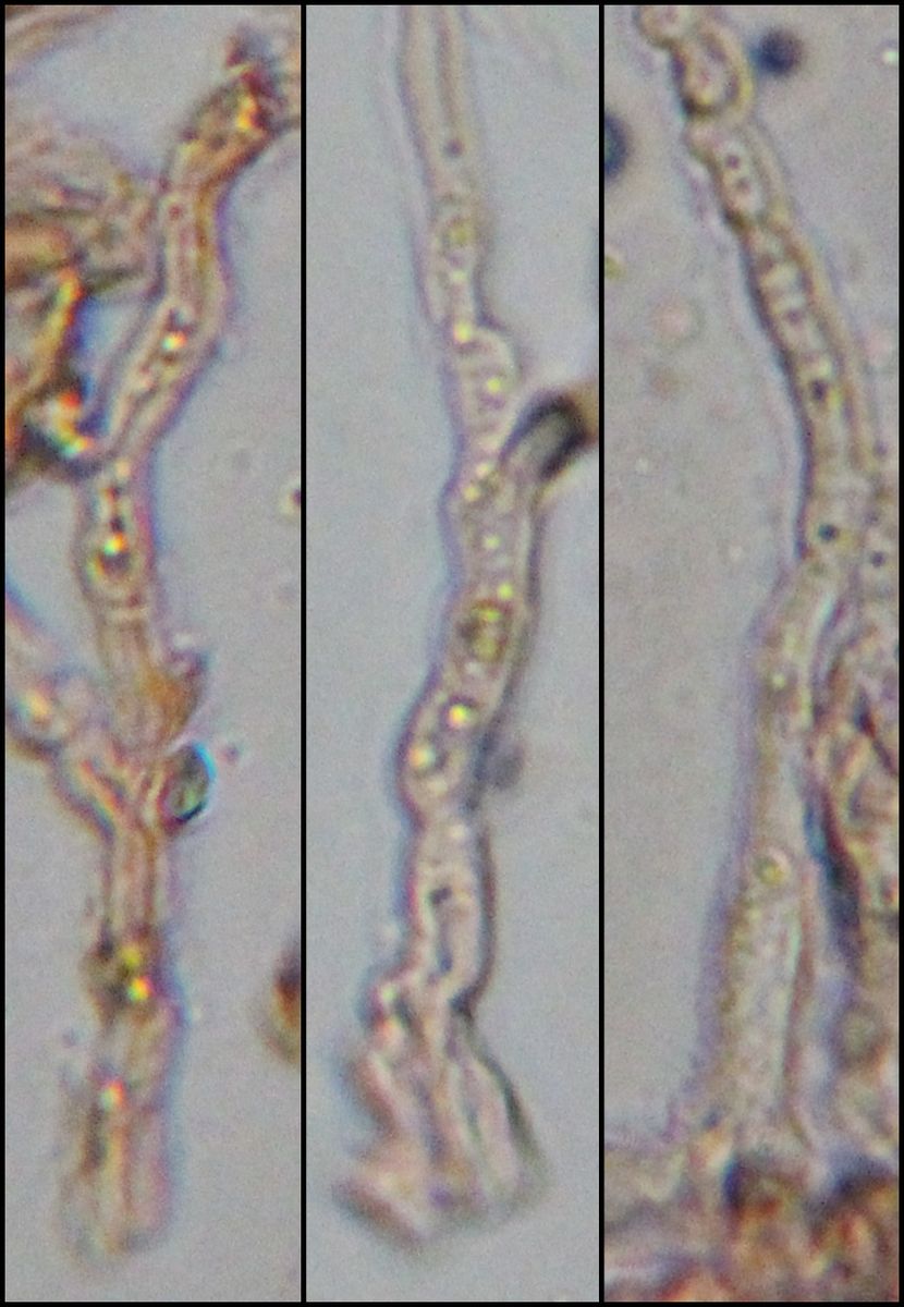 Wenn es sich bei den dickwandigeren Objekten um Pseudozystiden handelt, müssten diese ja „with oily content“ (Eriksson et al., 1984, p. 1429) sein, sie haben aber teils einen bräunlichen Inhalt, teils keinen (sichtbaren), deshalb bin ich mir hier noch etwas unsicher. Womöglich kann man gloeoplere Hyphen aber auch als Pseudozystiden deuten? Pseudozystiden sind ja keine echten Zystiden, sondern eigentlich Hyphen. Auch hier äußere ich aber nur vage Vermutungen.