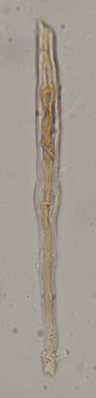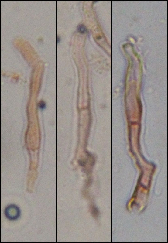 Zudem gibt es noch einen weiteren, dickwandigeren Hyphentyp, den ich für Skeletthyphen halte. Diese kommen sowohl in transparenter Form als auch mit braunem Inhalt vor:
