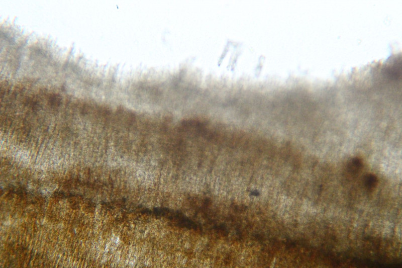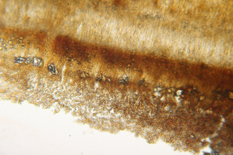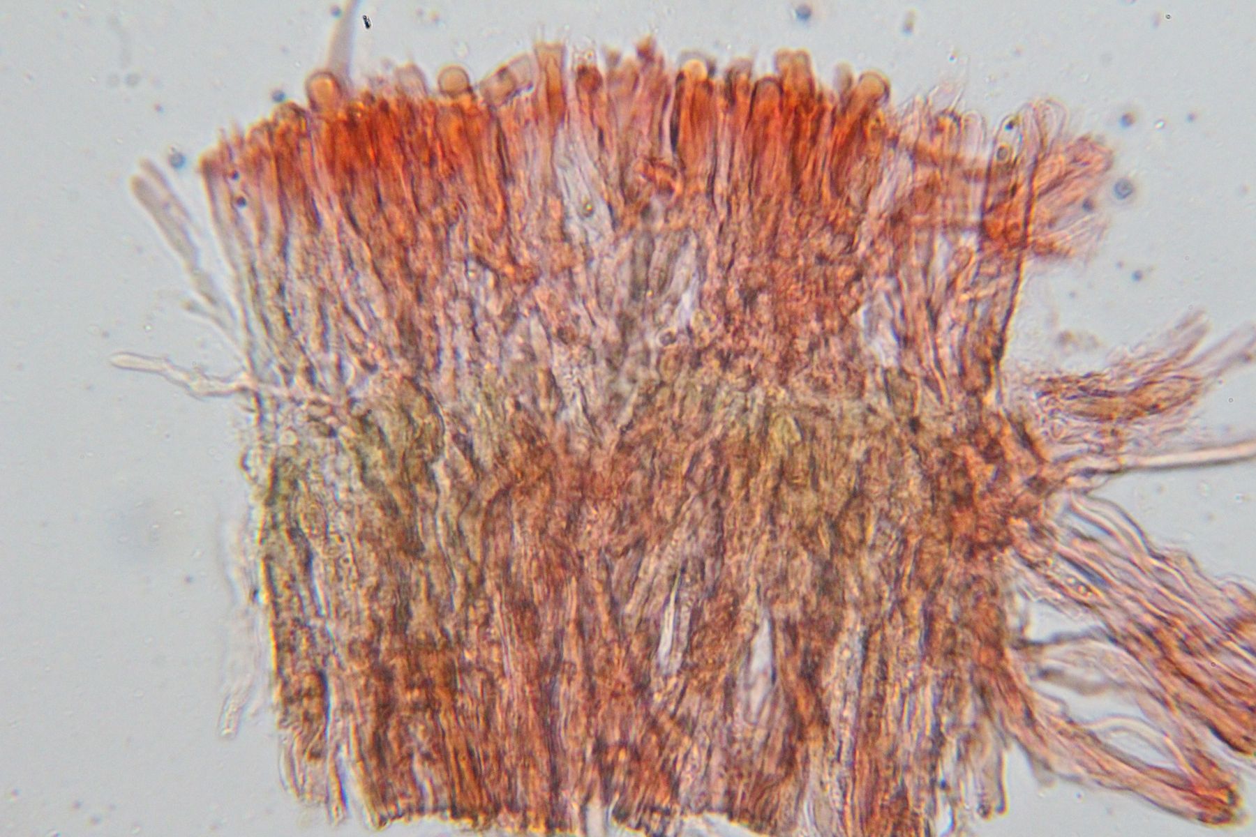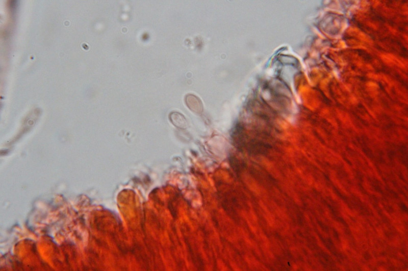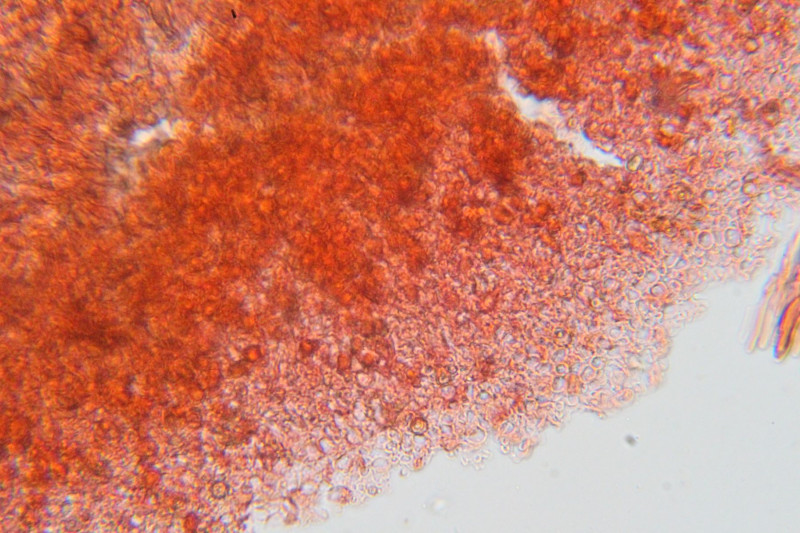 Aufgrund der leichten rötlichen Verfärbungen auf der Unterseite dachte ich erst, das Exemplar könnte gloeoplere Hyphen enthalten. Zwar konnte ich Hyphen mit tropfenförmigen Inhalt finden, allerdings waren diese in zu geringer Anzahl, nicht um Vaukolen angeordnet und auch nicht mit Sulfovanillin verfärbend: