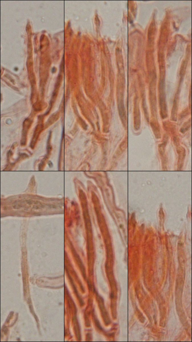 Ich habe sie bisher aber nie als Acanthozystiden wahrgenommen. Sie sehen meiner Ansicht nach nicht aus wie in der oben gezeigten Zeichnung von Bernicchia & Gorjón, 2010, p. 640; Clémençon, 1997, p. 534 beschreibt sie als „apikal kurz fingerförmig verzweigte, dünnwandige, farblose, terminale Zystiden“ und zeigt diese Abbildung:
