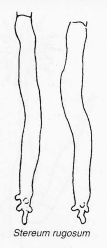Mikroskopisch gesehen passt zu Stereum rugosum zu meiner Verzweiflung leider einiges nicht. Neben den von dir erwähnten Acanthozystiden, die ich in keinem meiner Präparate finden konnte, sehe ich noch die folgenden Probleme (Infos aus Eriksson et al., 1984, p. 1429 entnommen):