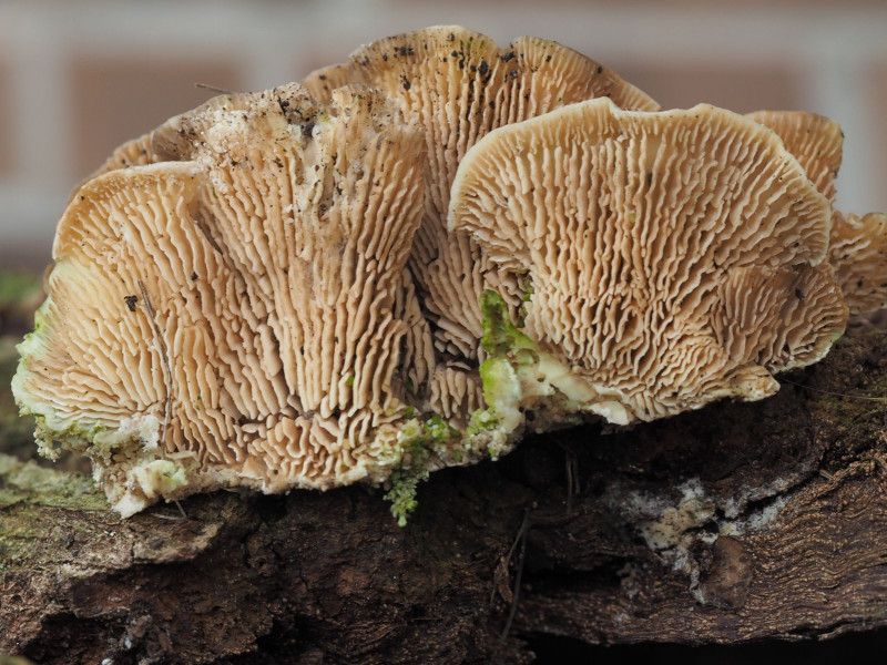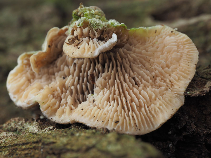 Bild 4: Einzelner Fruchtkörper von unten, weiß-gelbliche breite, radiär angeordnete Lamellen