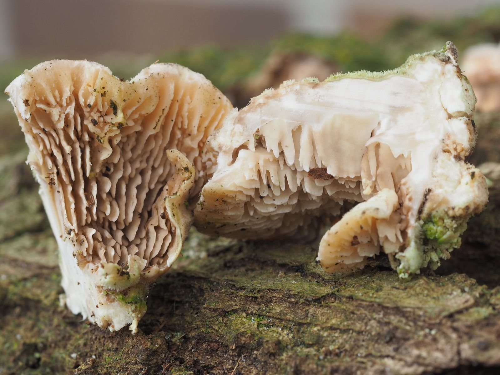 Bild 5: Rechts ein Schnitt durch den FK zeigt dicke weißliche Trama und breite Lamellen