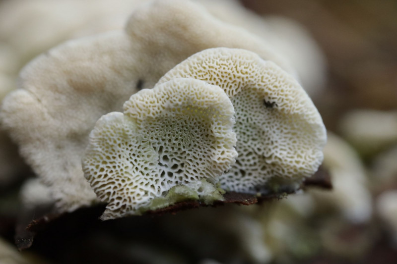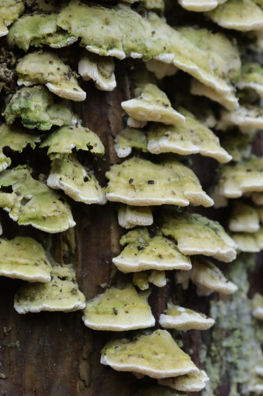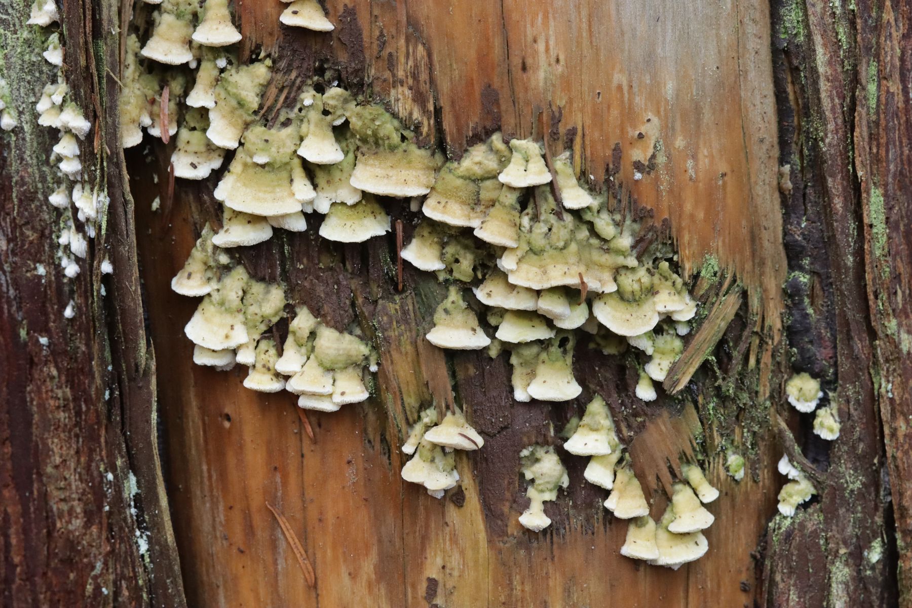 ich war am letzten Samstag im Wuppertaler Arboretum, einem Wald in dem verschiedenste Bäume in Rein- und Mischkultur gepflanzt sind um sie auf ihre Eignung als Forstbäume der Zukunft zu untersuchen. Das ist einerseits sehr nett, weil man dann auch im Flachland mal die Chance auf Pilze an Tannen bekommt, andererseits auch sehr ernüchternd, weil dort sehr wenig Totholz im Wald liegt. Außerdem ist die Bestimmung der ganzen exotischen Bäume natürlich alles andere als trivial. An einer Stelle gab es dann einen stehenden, mehrere Meter hohen Stumpf eines Nadelbaums (Sumpfzypresse?, Mammutbaum?), am dem sehr zahlreich ein weißlicher Porling wuchs. Leider entpuppt sich die Bestimmung als schwierig.