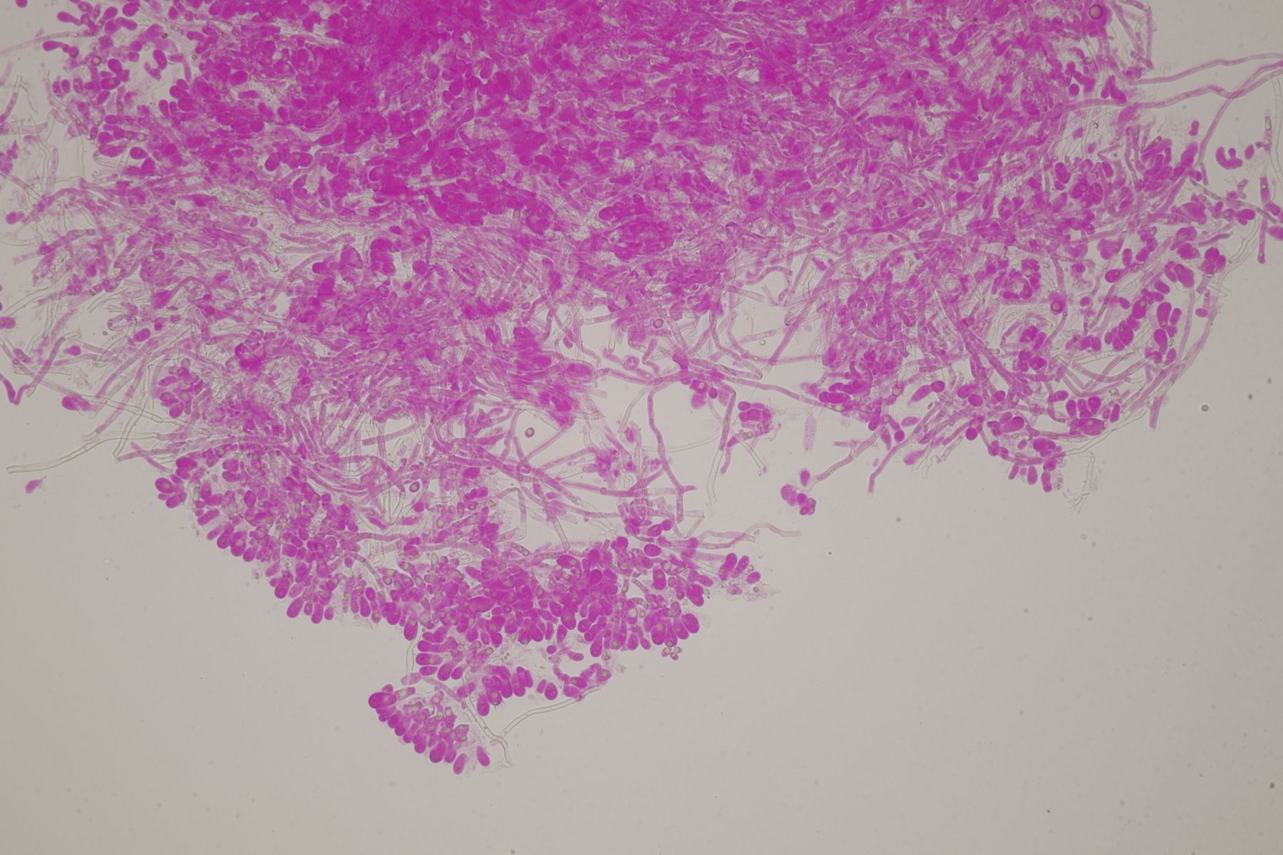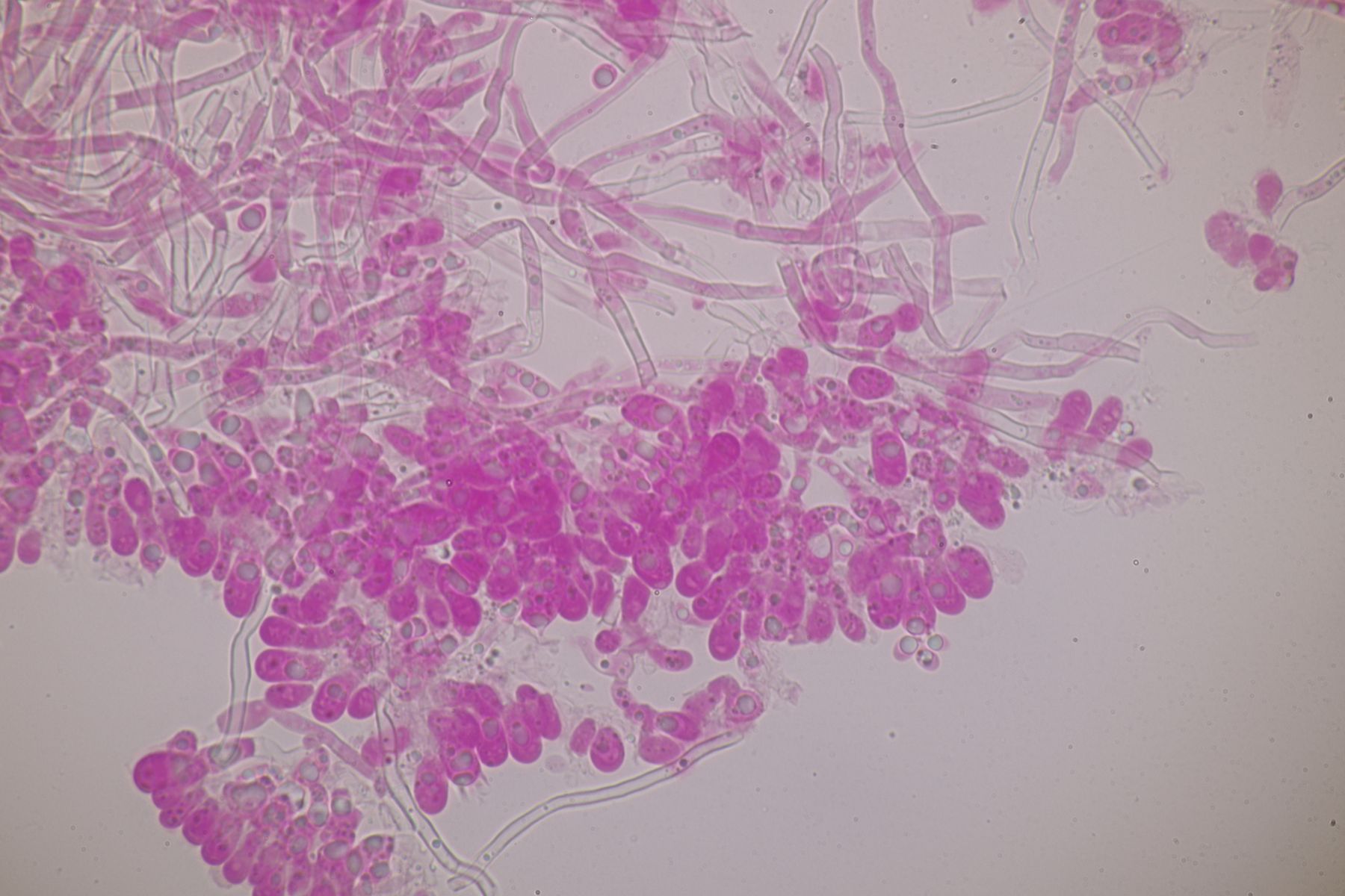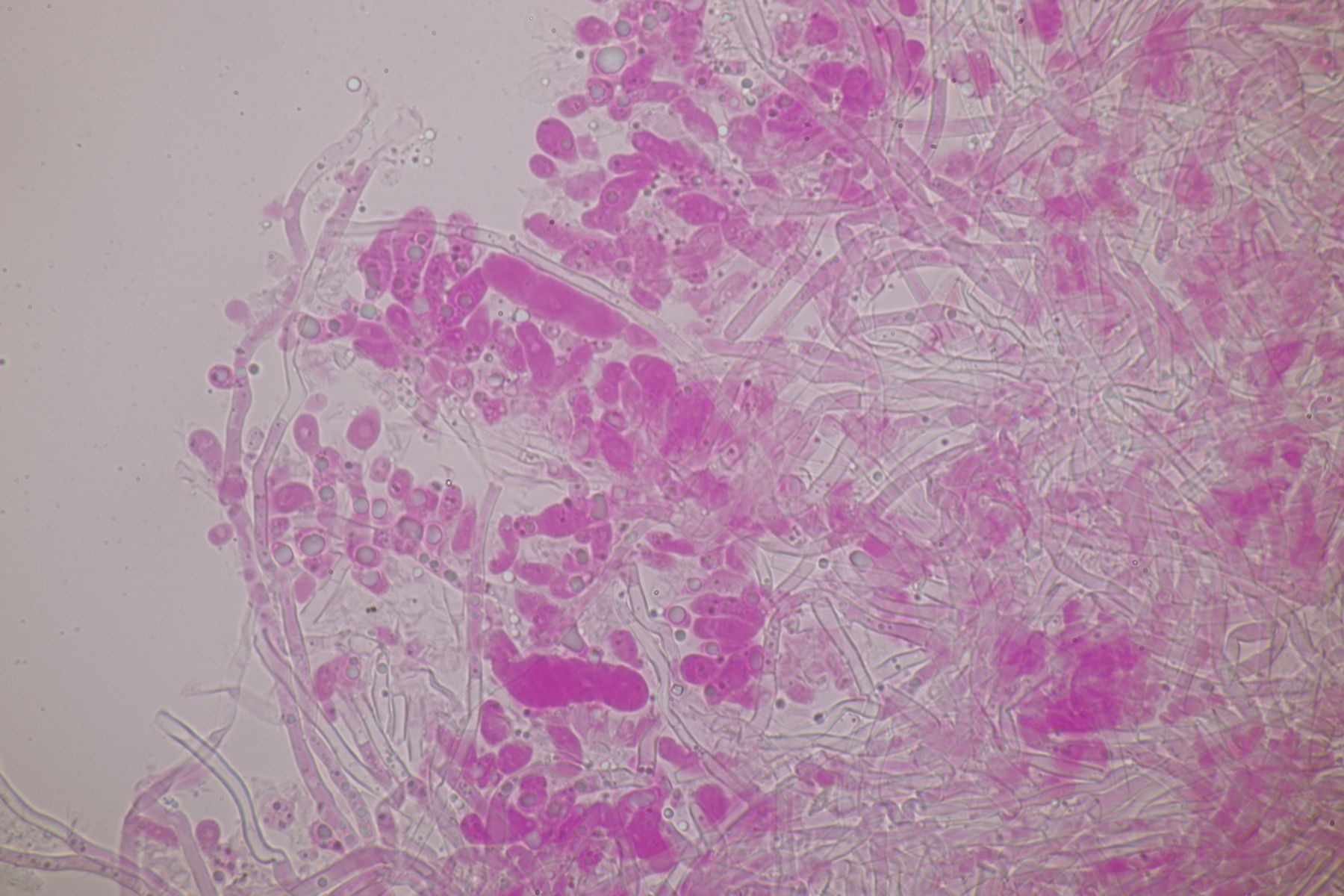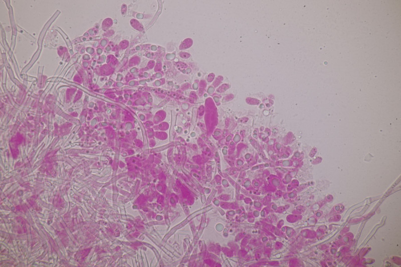 Hymenium: Septen der generativen Hyphen ohne Schnallen, Basidien 4-sporig ohne Basalschnalle, Zystiden wahrscheinlich nicht vorhanden (auch wenn es an einigen Stellen größere Blobs gab, siehe unten), Hyphensystem monomitisch, Hyphen weder amyloid noch dextrinoid