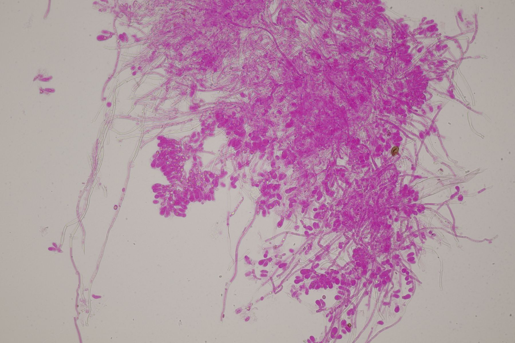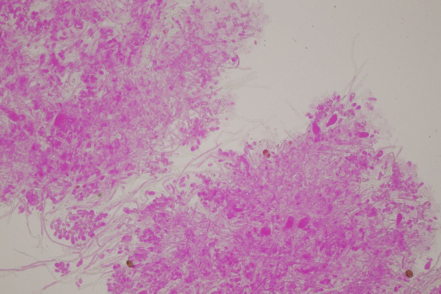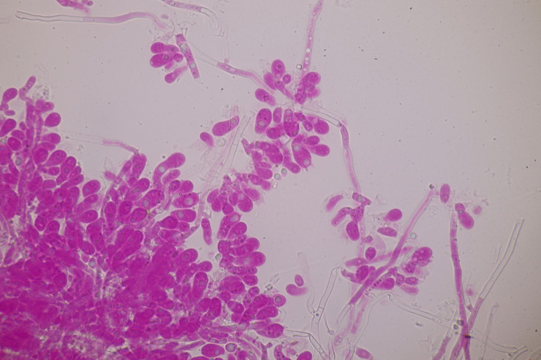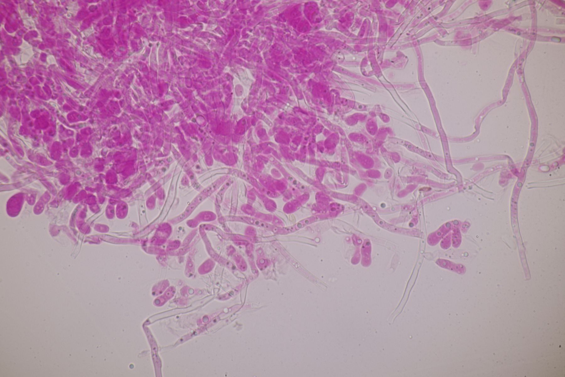 Hymenium: Septen der generativen Hyphen ohne Schnallen, Basidien 4-sporig ohne Basalschnalle, Zystiden wahrscheinlich nicht vorhanden (auch wenn es an einigen Stellen größere Blobs gab, siehe unten), Hyphensystem monomitisch, Hyphen weder amyloid noch dextrinoid