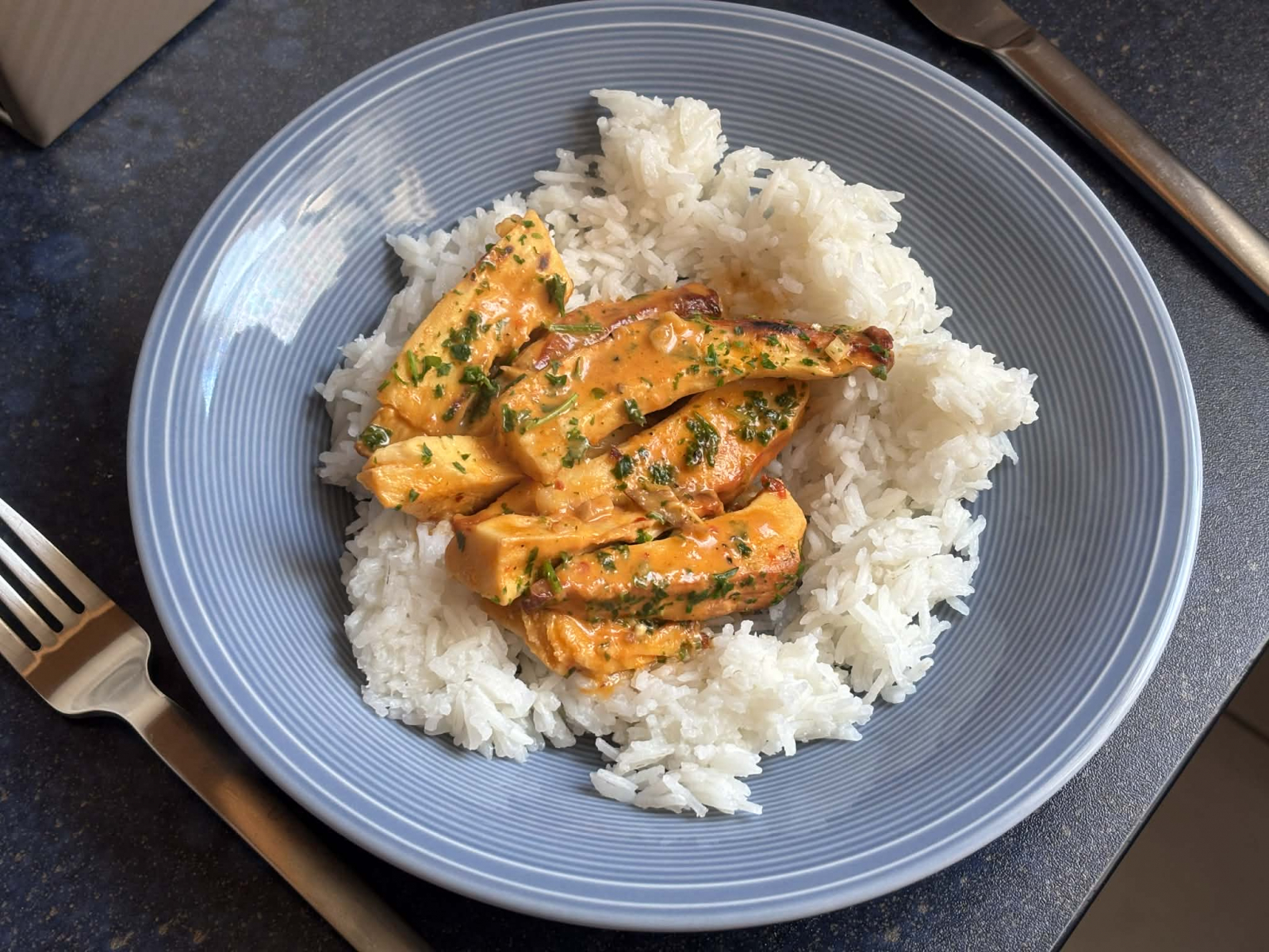 - Hitze wegnehmen, frischen Koriander darüberstreuen, dazu passt Reis sehr gut