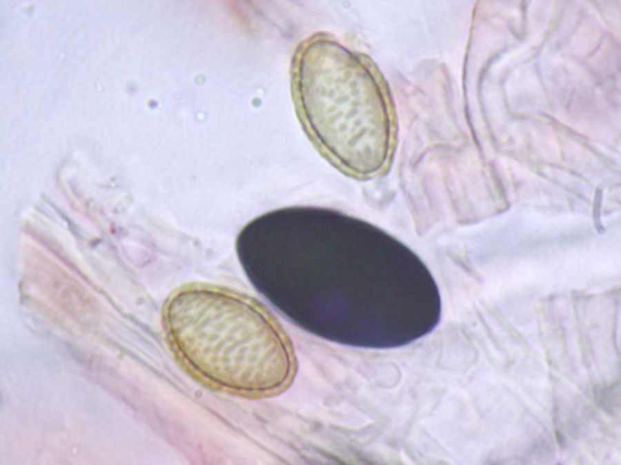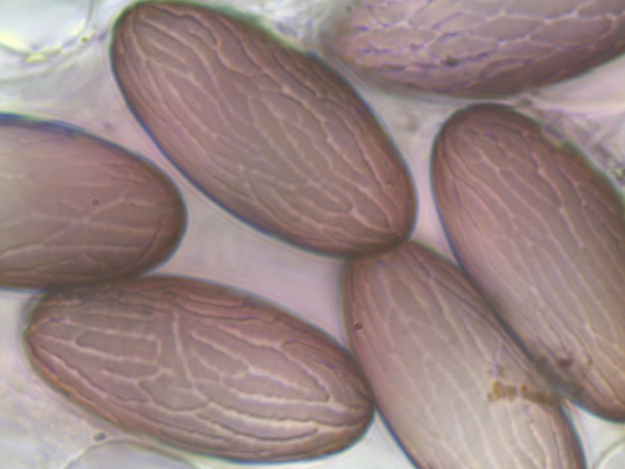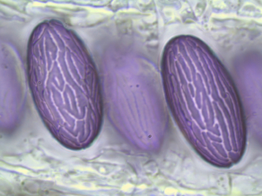 Größe: 12 x 7-8 µm ohne Ornament, 12,5-13 x 8-8,5 mit Ornament. Sie zeigen einen Rand, der entstanden ist, weil ich die Sporenfotos gestapelt habe.